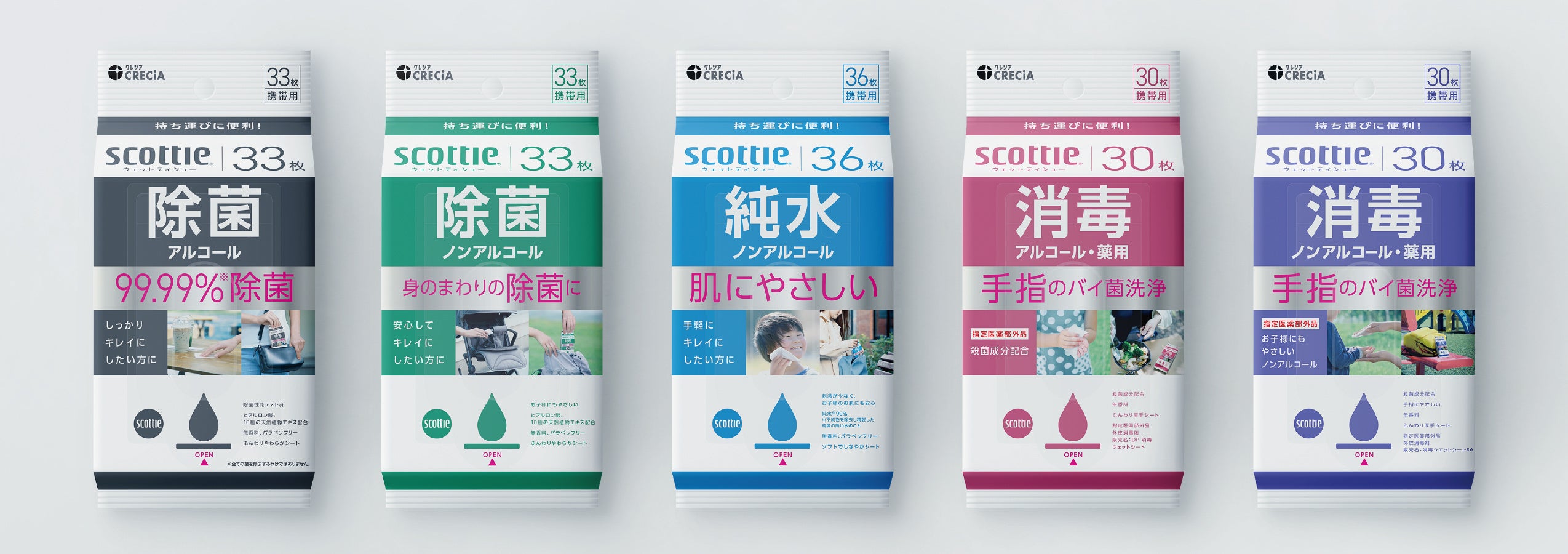 どこでも、サッと、しっかり。スコッティの携帯用ウェットティシュー。「純水ノンアルコールタイプ」新発売!