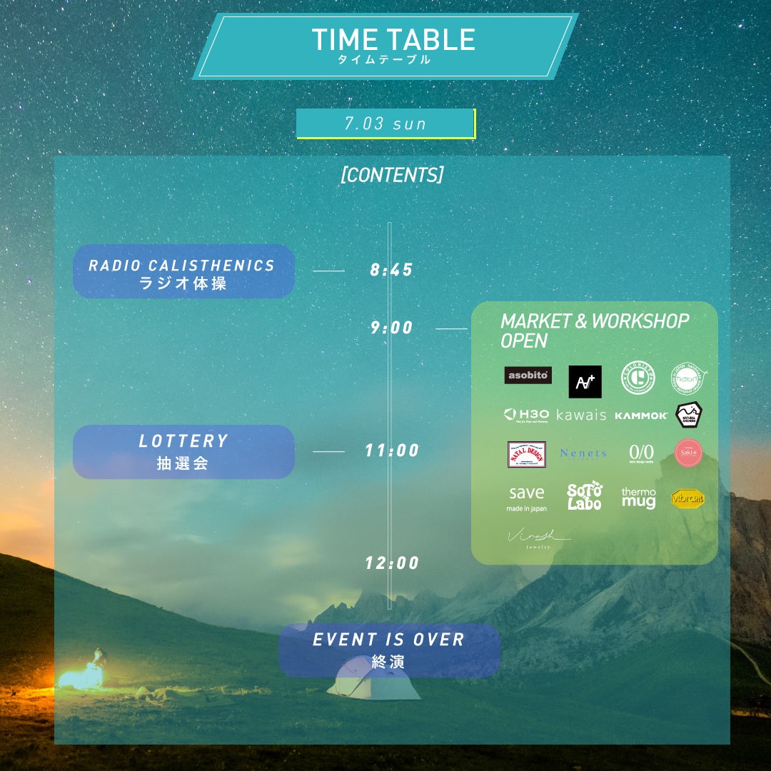 2日目となる7月3日(日)は、朝のラジオ体操から始まり、来場者全員参加ができるDANNERシューズや出展ブランドのアパレル・アクセサリー等豪華景品が当たる抽選会の実施も決定。