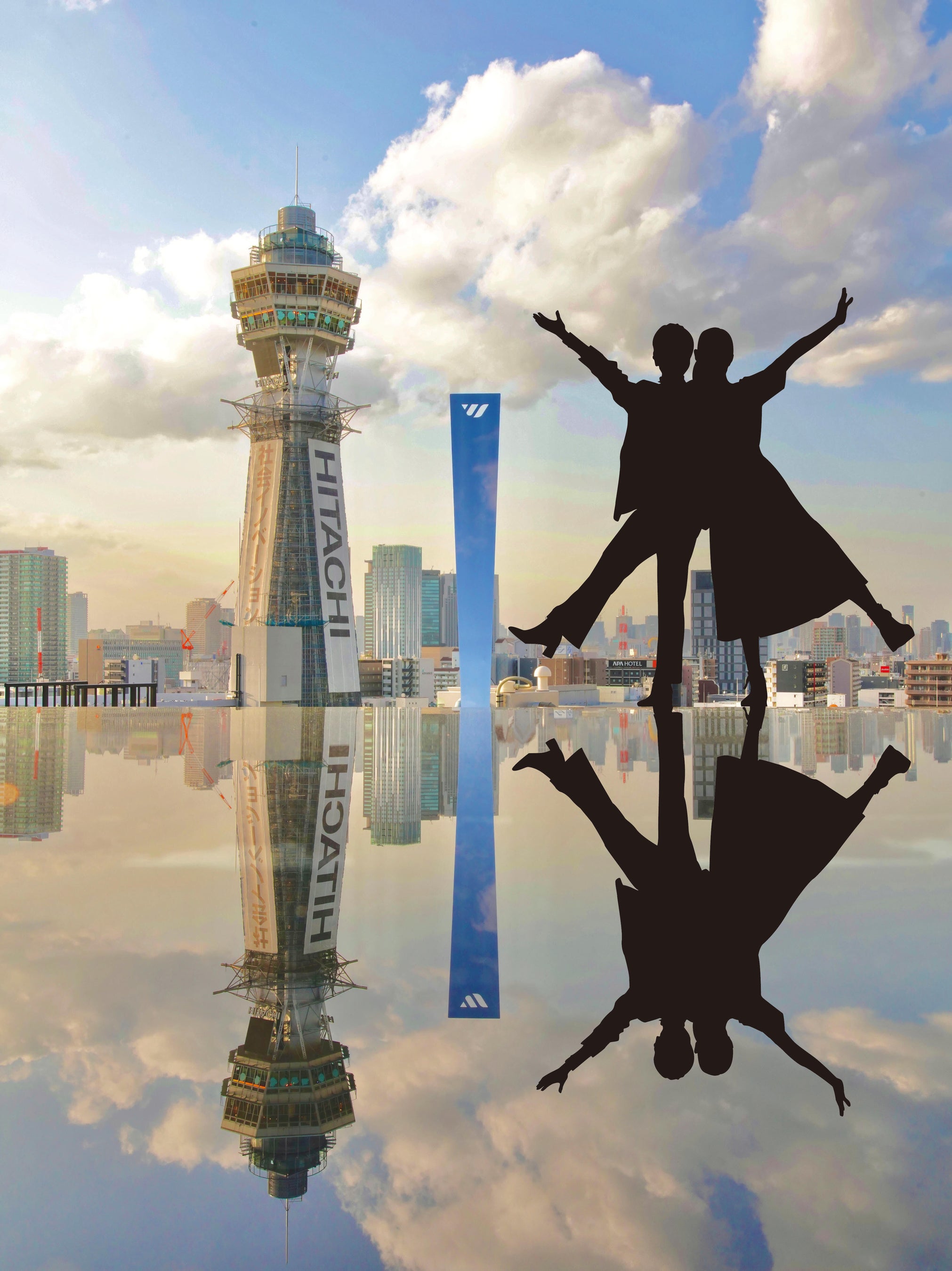 サービス内容:通天閣をバックに、鏡面写真をお客様のスマートフォンで撮影
