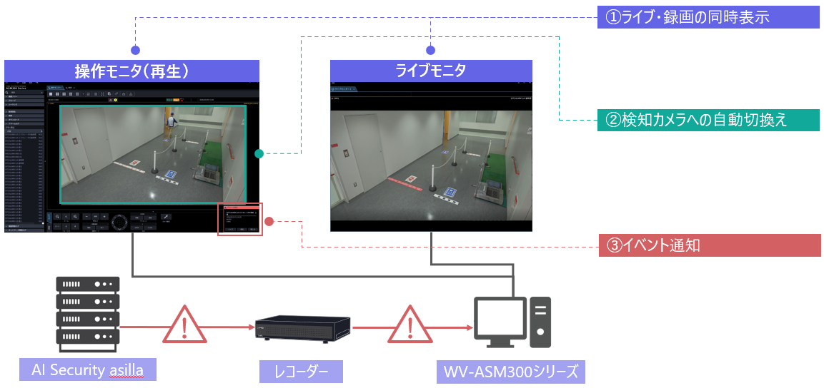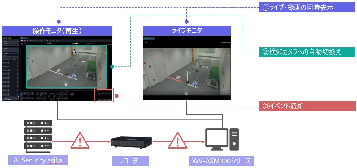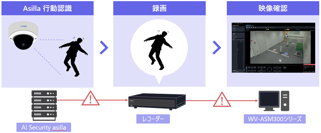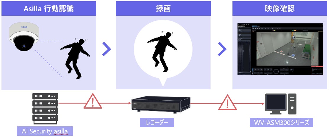 今回のi-PROのレコーダー&映像監視ソフトとの連携により、asillaが検知した異常行動や注意行動の情報を、i-PROの管理システムに即座に自動で表示できるようになりました。連携の対象となるのは、当社のネットワークディスクレコーダー(WJ-NXシリーズ(※)、WJ-NUシリーズ)、および、映像監視ソフトウェア(WV-ASM300シリーズ)です。