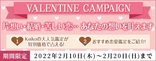 テレシスネットワーク株式会社(本社:東京都港区、代表取締役:鷹石惠充 https://www.telsys.co.jp/)は、2022年2月10日(木)より、月額公式サイト『Keiko◆ルナロジー占い』にて、『Keiko◆ルナロジー占いバレンタインキャンペーン』の提供を開始いたしました。