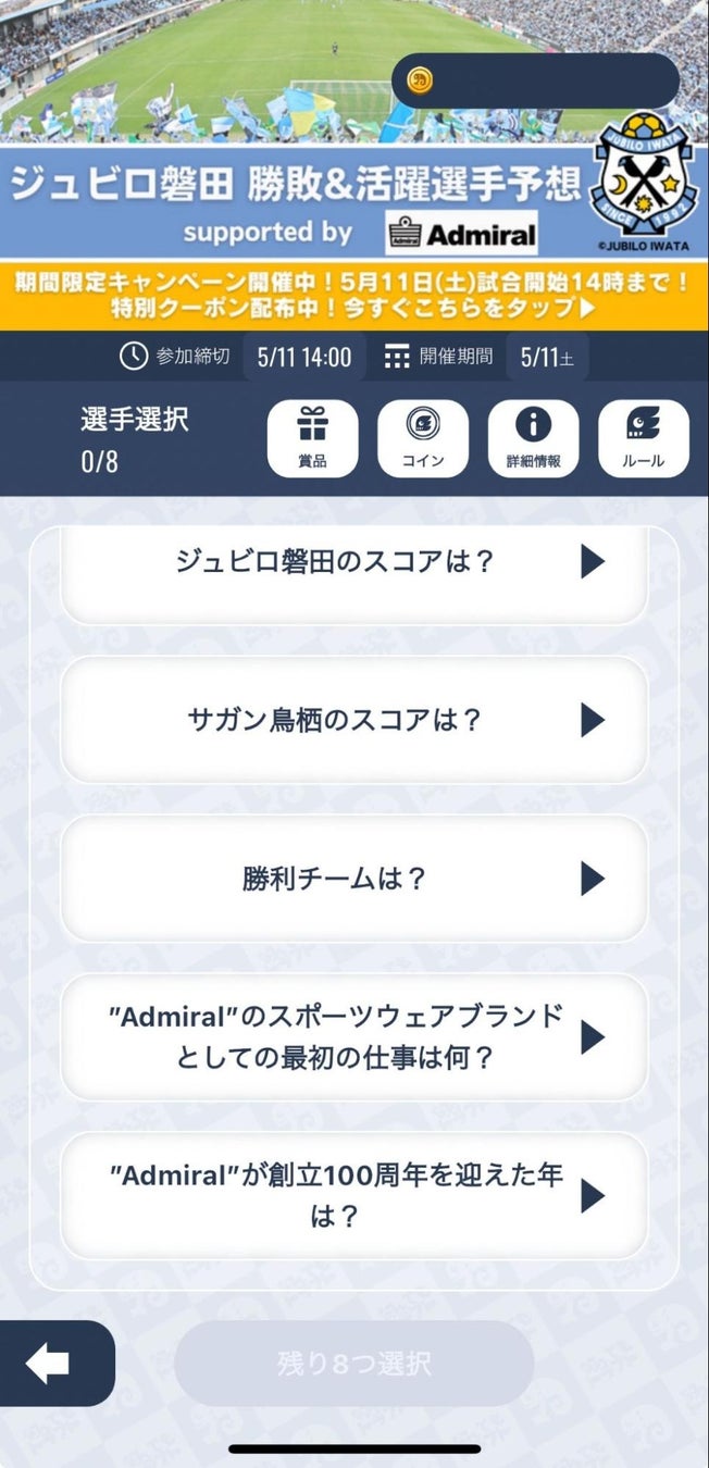 ジュビロ磐田公認試合展開・活躍選手予想supported by Admiralを5月11日(土)サガン鳥栖戦対象にスポーツ予想アプリ「なんドラ」で開催!