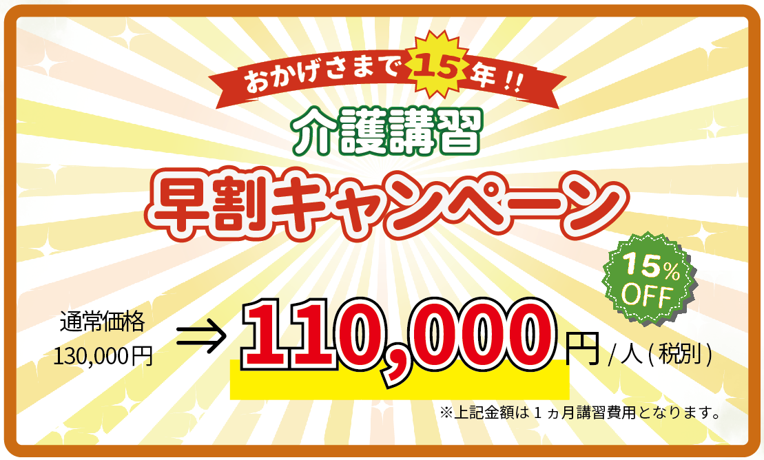 【介護講習費⽤が15%OFF】入国後講習の早期予約で通常より2万円以上お得に!!<介護講習早割キャンペーン>を感謝を込めて開催中!!