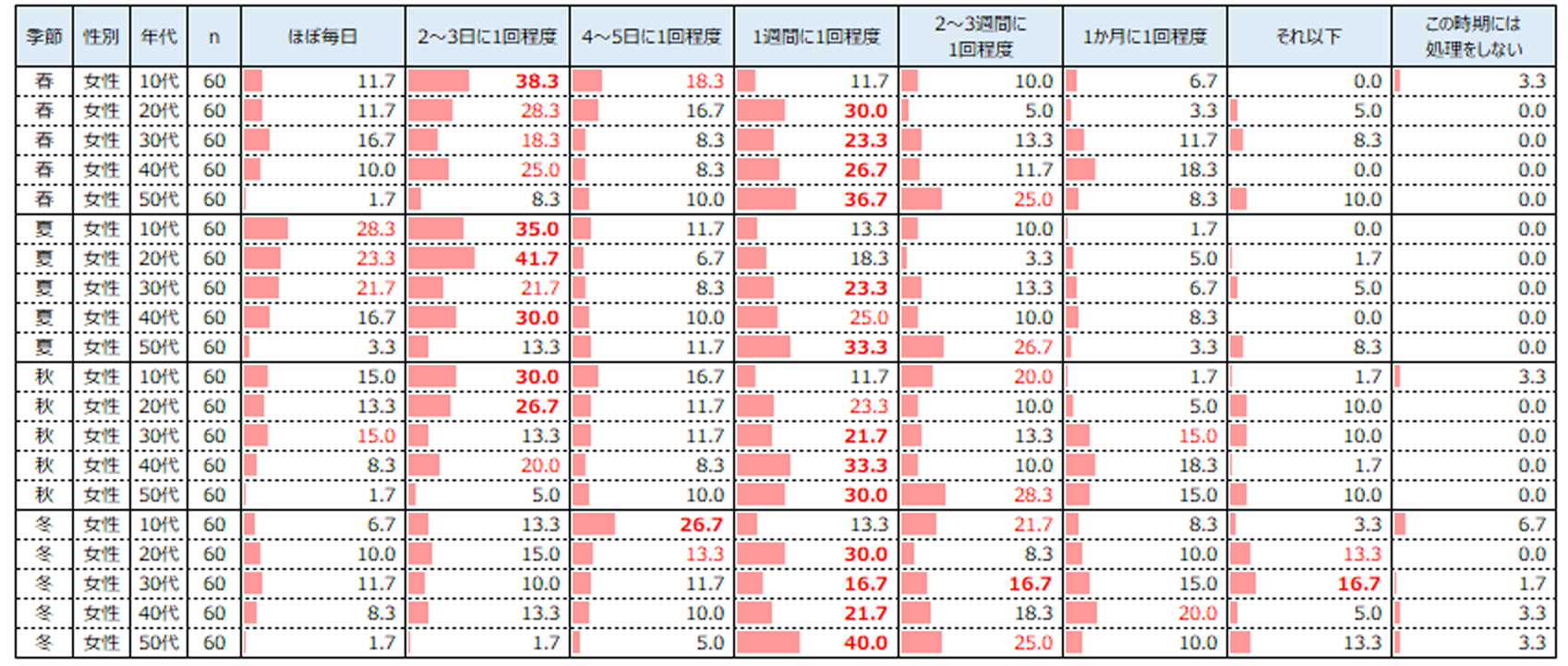 性別・世代別で比較すると、世代によりケア頻度の差があります。世代別に見ても男性は季節による差が小さい結果です。