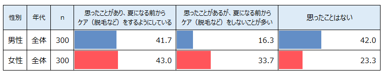 また、「夏になる前(暖かくなって薄着になる前)に体毛ケア(脱毛など)をしておけばよかった」と思ったことはありますか、という問いに対し、男性の58%・女性の76.7%が「思ったことがある」と回答しました。そう思った理由を自由回答で調査した結果、「急な温度変化」「温泉やサウナ」「周囲の視線」という意見が男女共通で挙がり、男性はハーフパンツを着る際に気になった、という意見もありました。女性からは、脱毛に時間がかかる、というような意見が男性より多く挙がりました。