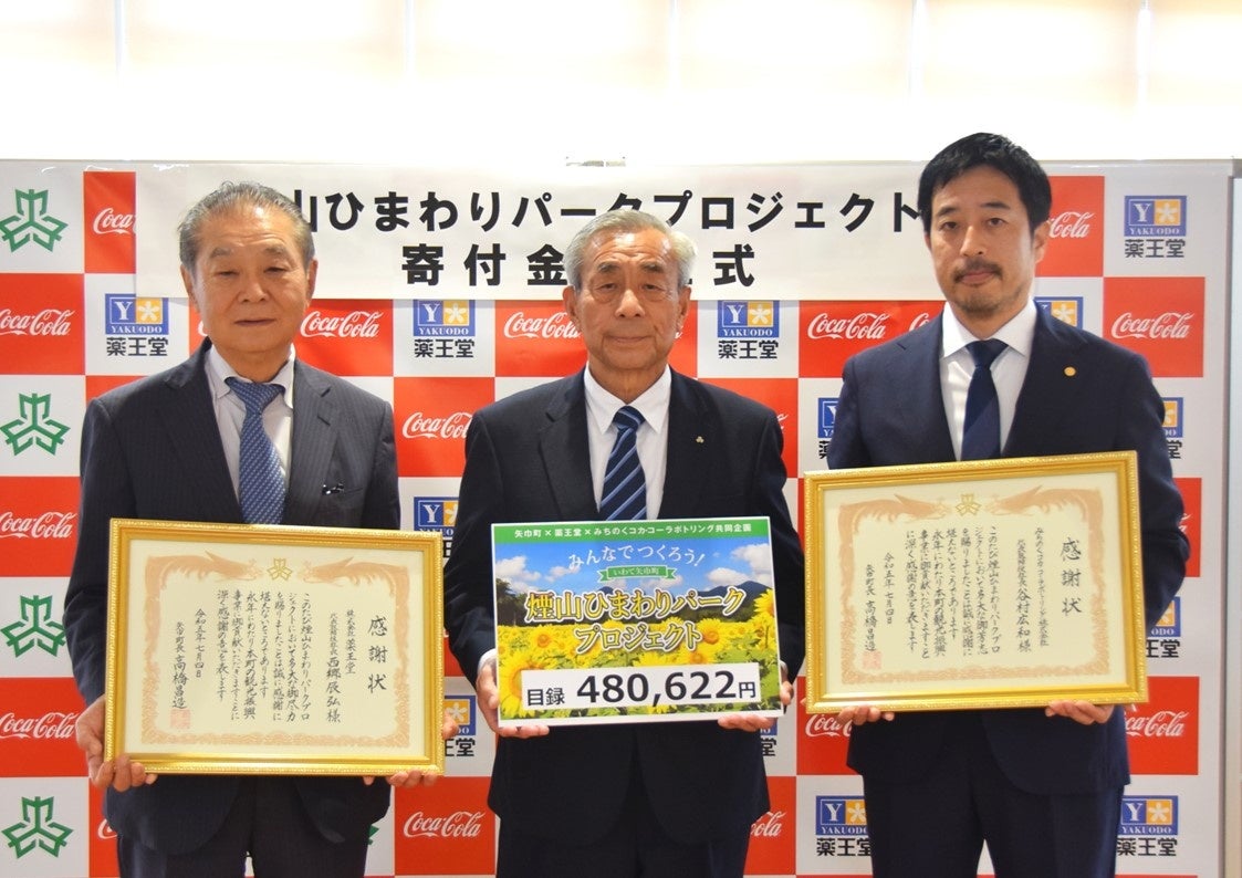 このプロジェクトは、2022年9月1日(木)~ 2023年2月28日(火)までの期間、薬王堂各店の店頭キャンペーンとして展開したものです。対象製品の売上の一部が矢巾町へ寄付され、産業振興の取り組みとして「煙山ひまわりパーク」の観光開発活動に役立てられます。このたびの寄付金は480,622円で、2018年から実施しているこのキャンペーンの寄付金額の合計は2,462,068円となりました。