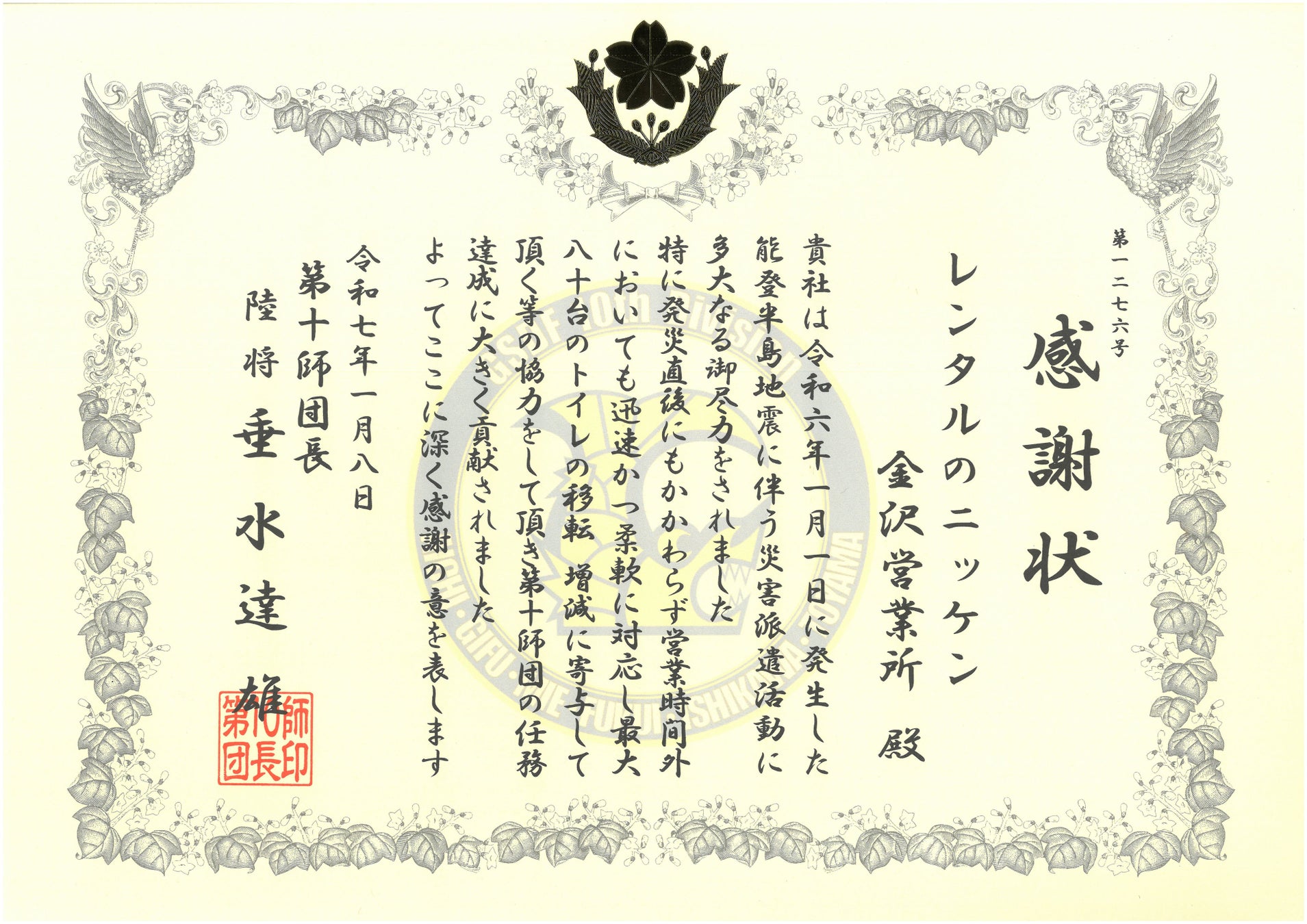 株式会社レンタルのニッケン(本社:東京都港区、社長:齊藤良幸)は、2025年1月8日陸上自衛隊 第十師団より、令和六年能登半島地震における当社金沢営業所の対応を評価され感謝状を授与されました。