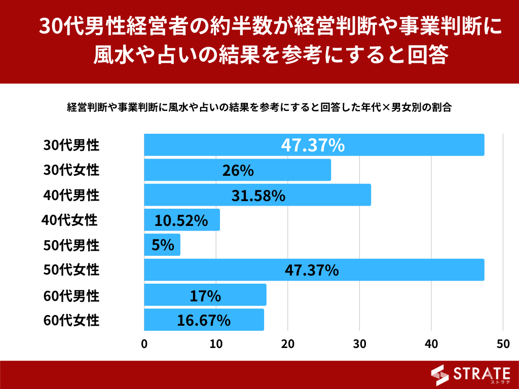 経営判断や事業判断に風水や占いの結果を参考にすると回答した割合を年代×男女別でみてみますと、最も多いのが30代男性と50代女性の47.37%、次いで40代男性の31.58%、50代男性は5%にとどまりました。