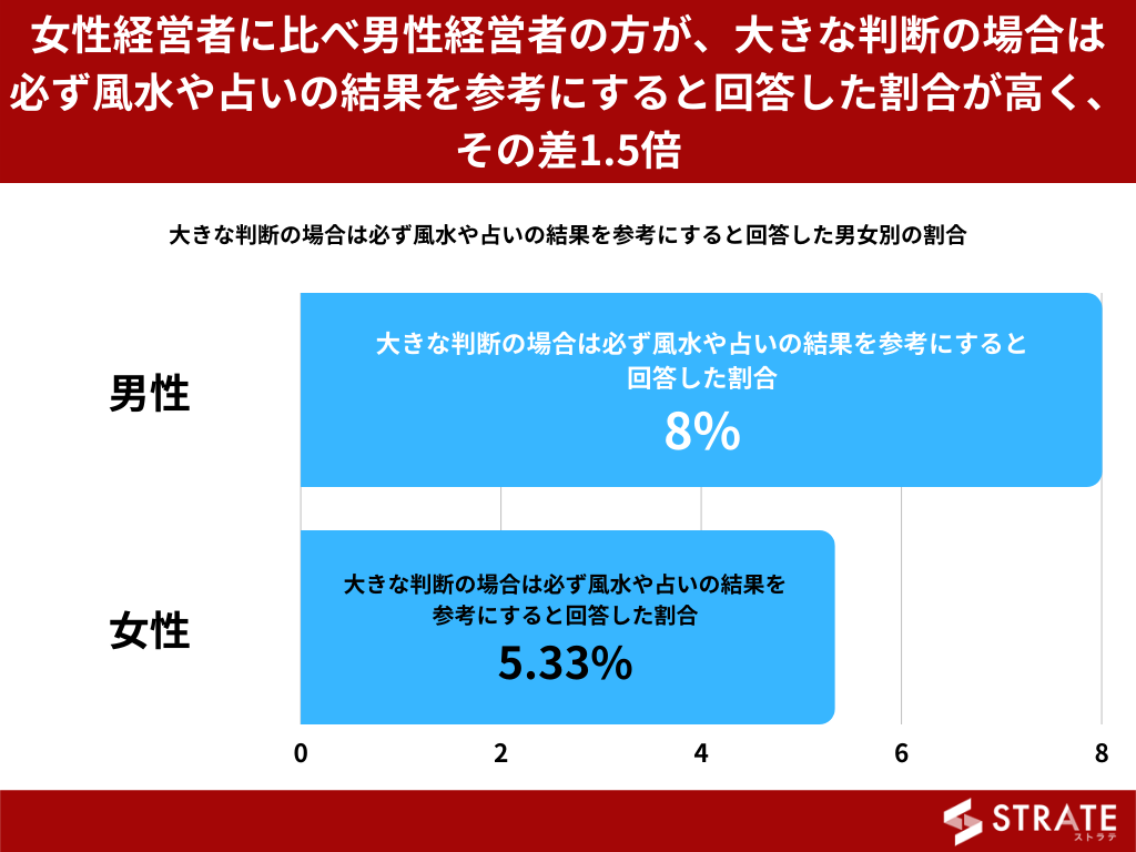 【女性経営者に比べ男性経営者の方が、大きな判断の場合は必ず風水や占いの結果を参考にすると回答した割合が高く、その差1.5倍】