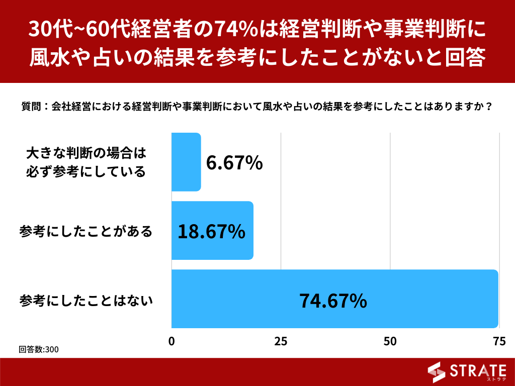 30代〜60代の男女を対象とした「会社経営における経営判断や事業判断において風水や占いの結果を参考にしたことはありますか?」というアンケートで最も多かった回答は「参考にしたことはない」で74.67%でした。