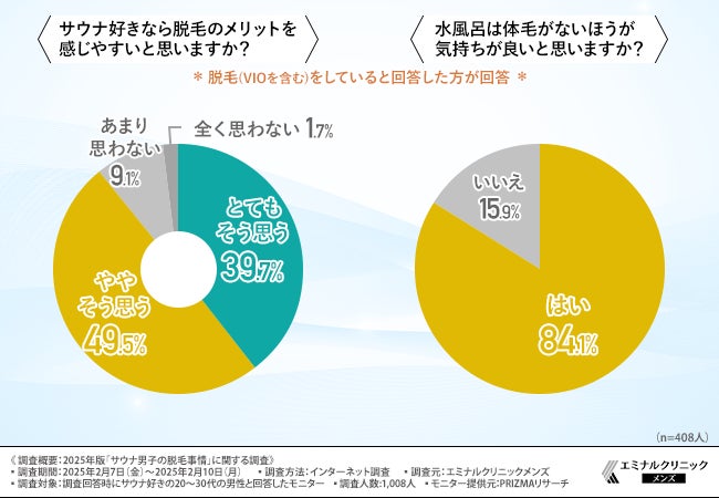 さらに、水風呂に関しても8割以上の方が「体毛がないほうが気持ちいい」と回答しており、サウナと脱毛の相性の良さが示唆されました。