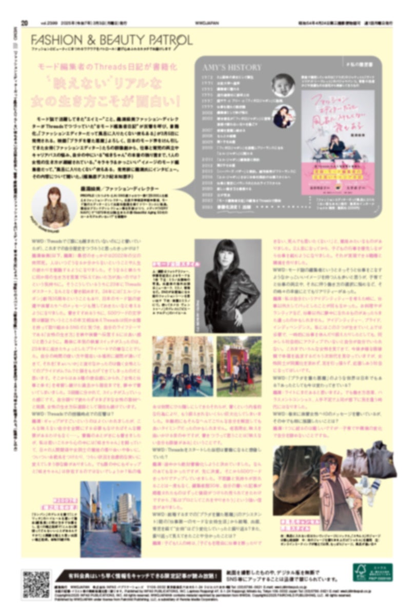 巻末の「ファッション&ビューティパトロール」コーナーでは、ファッション業界人の間で話題になっていた龍淵絵美ファッション・ディレクターによるThreadsの投稿“#モード編集者日記”について、本人にインタビュー。自身のキャリアや、投稿が書籍化に至った経緯などを聞きました。