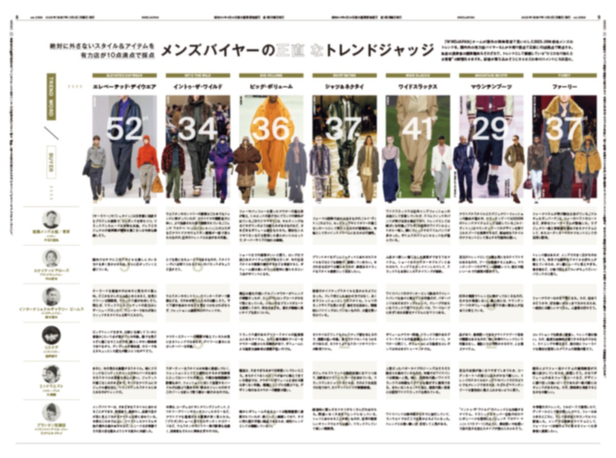 特集後半には、国内外の有力店のバイヤーが、「WWDJAPAN」が見いだしたトレンドに対し、10点満点で正直に採点する恒例企画も掲載。最高の10点を叩き出したトレンドもあれば、最低の1点がついたトレンドもあり、その理由を各店の分析と合わせて紹介します。さらに、米「WWD」による海外バイヤー評では、良かったブランドとマストアイテムを6人に聞きました。トップバイヤーから名前が挙がった「オーラリー(AURALEE)」「ジュンヤ ワタナベ マン(JUNYA WATANABE MAN)」は、どう評価されているのでしょうか。ほかにも、25-26年秋冬シーズンの参考になるメンズ情報が盛りだくさんです。
