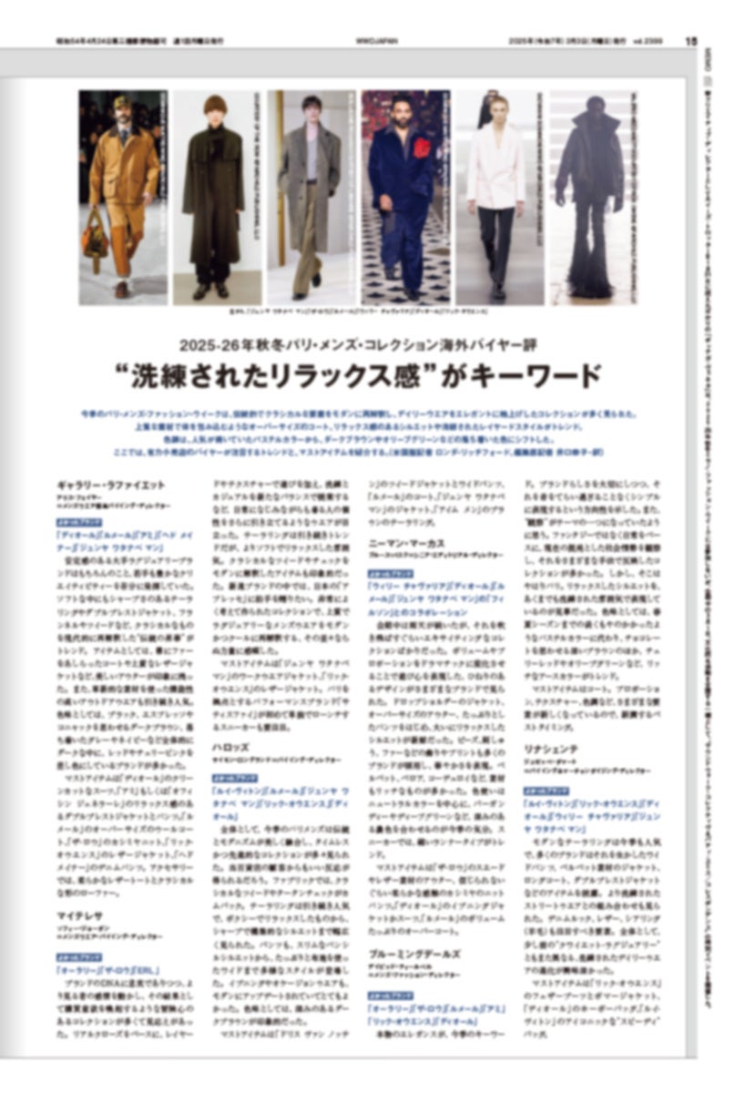 「WWDJAPAN」3月3日号は、2025-26年秋冬メンズ・トレンド特集です。1月の「ピッティ・イマージネ・ウオモ」からミラノ&パリメンズ、さらに2月のニューヨークとロンドンまで、全93ブランドの最新コレクション290ルックから、新たなメンズのトレンドを探ります。トレンドは、スタイル、アウター、トップス、パンツ、アクセサリーなど合計9つに分類し、カテゴリー別に新たな潮流を分析します。スタイルでは、近年はリアリティーのある提案が目立っており、デザイナーたちは何気ない日常と、自分自身の本能に従うことの大切さをコレクションを通じて訴えます。日常のワードローブをいかにアップデートするか、さまざまなアイデアが見られました。一方で、非日常ともいえる雪山や砂漠への冒険心に満ちた、アクティブなスタイルも台頭しています。