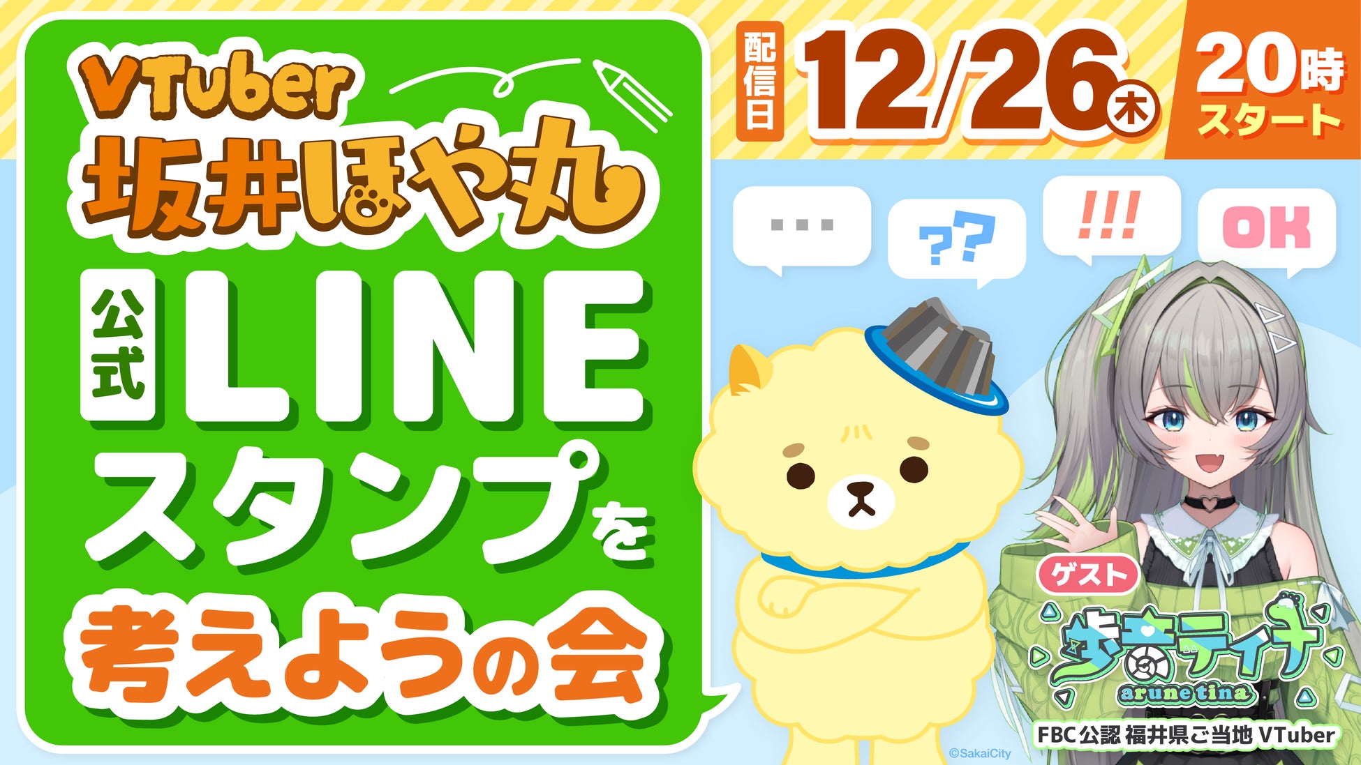 また、12月26日(木)にFBC公認福井県ご当地VTuber歩音ティナさんをゲストに、YouTubeでの生配信を行います。配信では、いただいたアイディアや当日のコメントなどをもとに、どのようなLINEスタンプのデザインを制作するかを一緒に考えます。