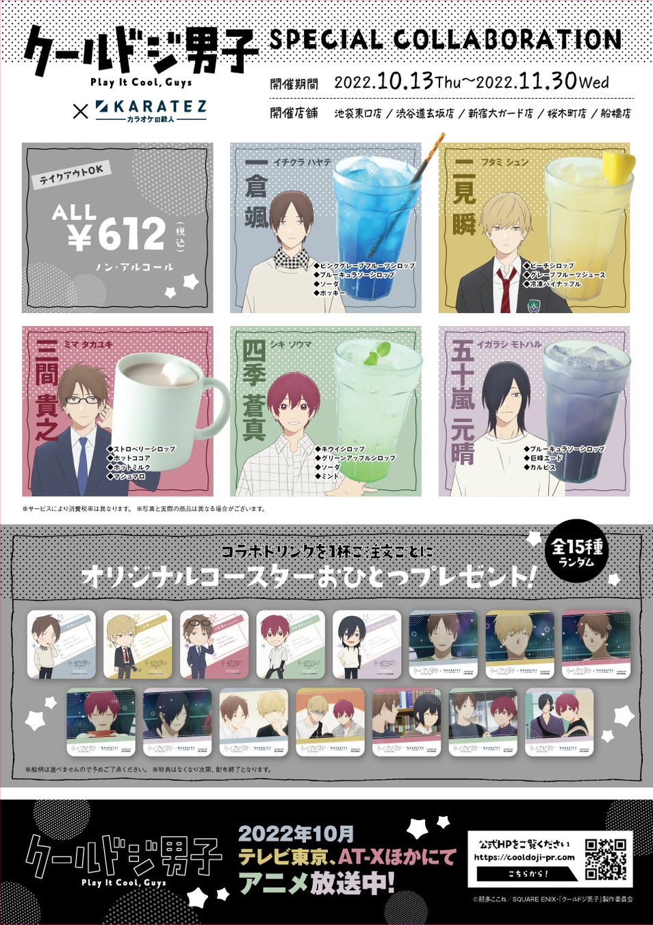 株式会社鉄人化計画(所在地:東京都目黒区、代表取締役社長:根来拓也)は、当社が運営する「カラオケの鉄人」の首都圏5店舗において、那多ここね原作によるTVアニメ『クールドジ男子』とのコラボレーションキャンペーン(以下「コラボ」)を、2022年10月13日(木)より開催します。