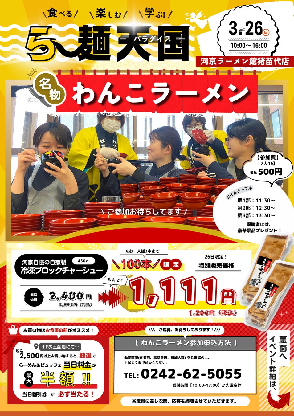 メインイベントは「わんこラーメン」!目玉は“大特価”河京自慢の「自家製冷凍ブロックチャーシュー販売」。その他にも「麺つかみ取り」や「重さ当て」などラーメン好きに嬉しいイベントをご用意しております。
