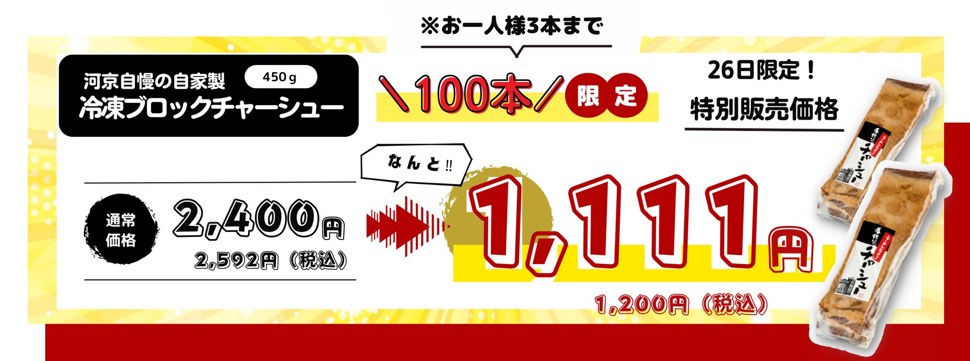 河京自慢の自家製冷凍ブロックチャーシュー、通常価格(税別)2,400円のところ、