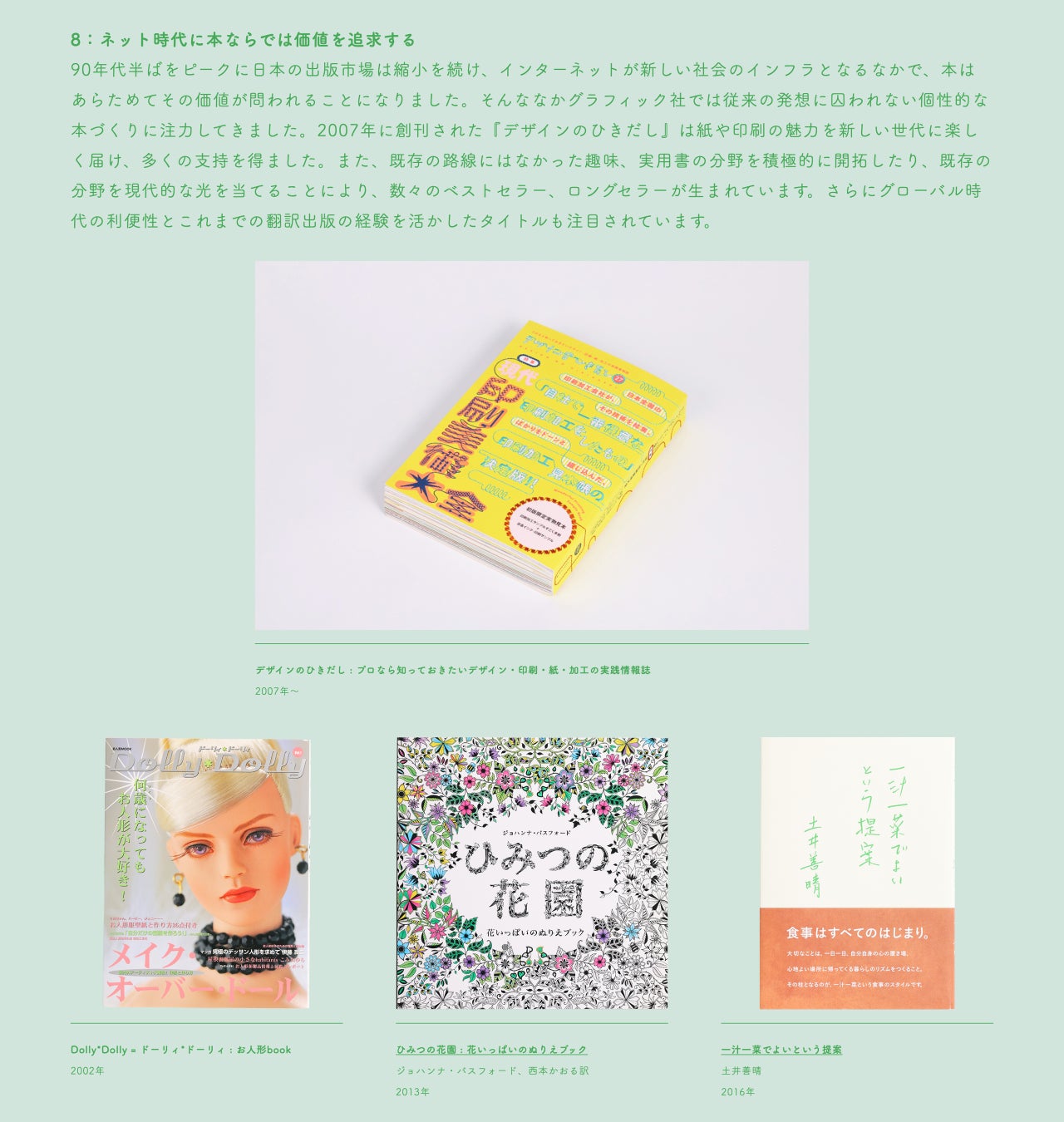 70年代の貴重なデザインの資料集や年鑑、建築書。90年代に欧米のマーケットでも注目を集めたマンガ技法書。紙・印刷加工の楽しさを伝える専門誌『デザインのひきだし』(2007年〜)、大人のぬりえブームを巻き起こした『ひみつの花園』(2013年)、20万部を超えるベストセラーとなった料理書『一汁一菜でよいという提案』(著者:土井善晴/2016年)など、各時代を特徴づける書籍を多数ご覧いただけます。