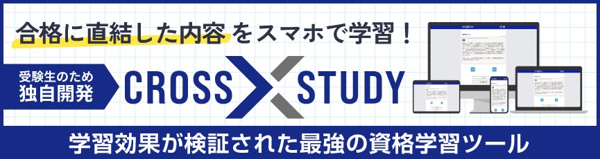 資格指導歴55年のクレアールは合格に必要な学習範囲を戦略的に絞り込み、短期合格を目指す独自メソッド(非常識合格法)を反映した教材を提供しています。その教材の内容を着実かつ効率的に記憶に定着させるために開発したのがWeb学習ツール「CROSS STUDY」です。CROSS STUDYを使用して演習を中心とした学習を進めることで、インプットした内容の「思い出す力」と「覚える力」を鍛えることができ、本試験での得点の向上につながります。