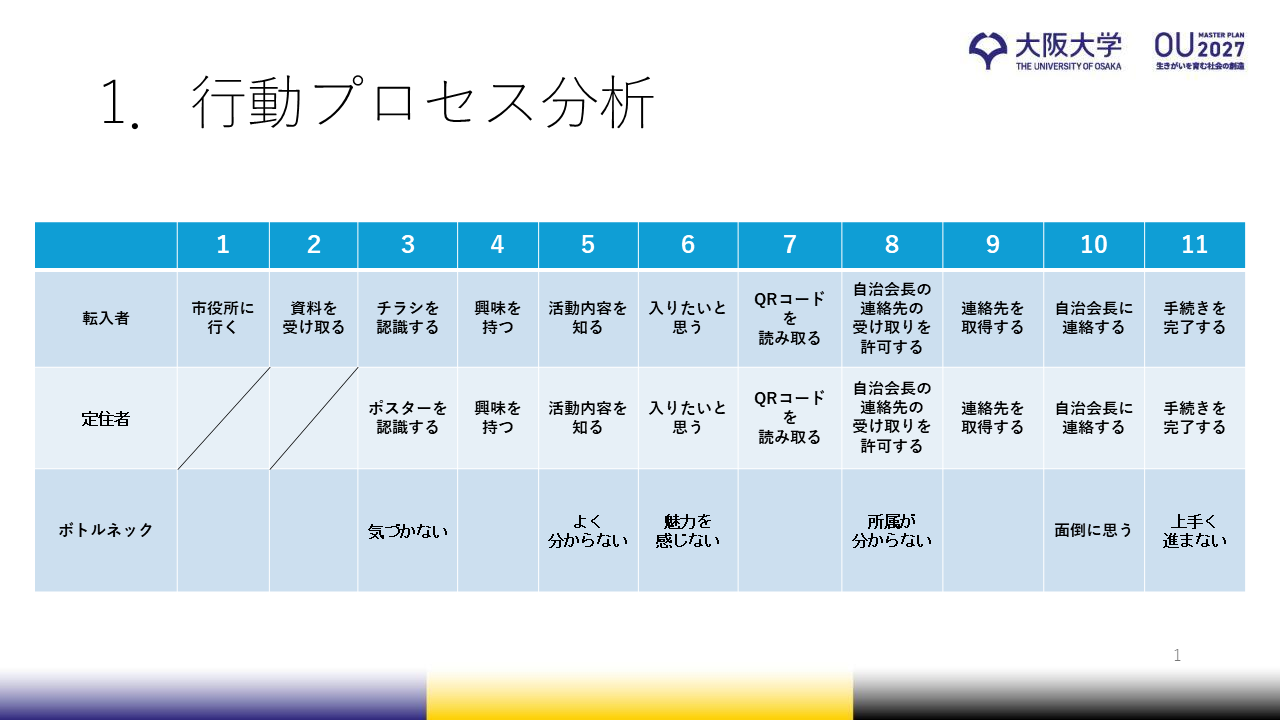 この取組は、福井市のナッジの普及促進を担う若手職員有志チーム「福井市ナッジ・ユニット」と、行動経済学のスペシャリストである大竹文雄教授を中心に学生が集まり結成された「大阪大学行動経済学研究会」との共同事業として進められたもので、自治会未加入者の行動プロセスを分析し、加入に至らない要因(ボトルネック)を明らかにすることから始まりました。