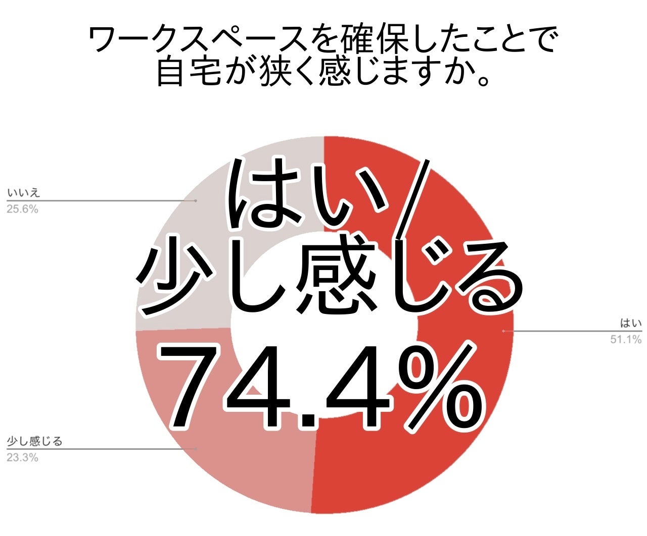 リモートワーク用のワークスペースは自宅内で場所をとることが多く、スペース確保のために自宅の荷物を整理整頓した方が多いことがわかりました。そこでアンケートでは、ワークスペースを確保したことで自宅が狭く感じるか尋ねてみました。