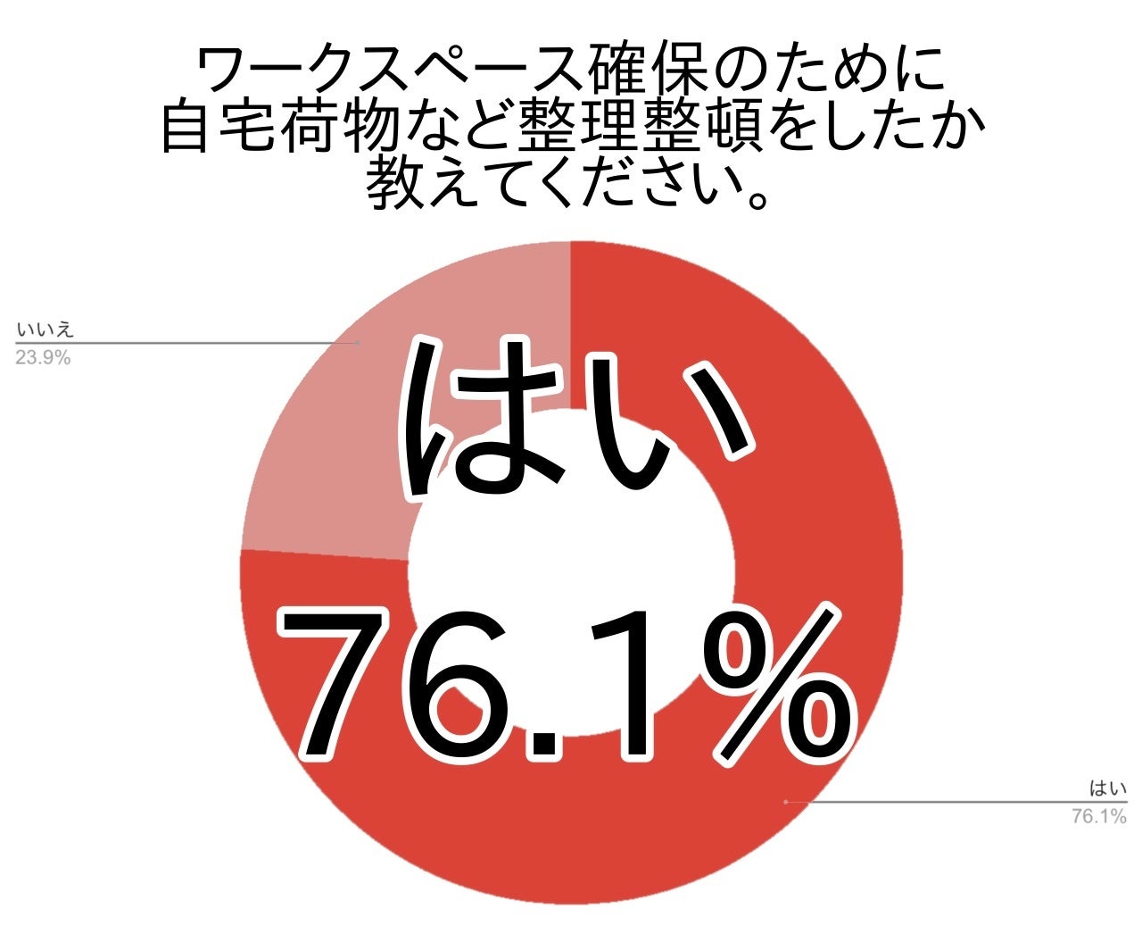 大ぶりなオフィス家具やPC・モニターを置いたり、仕事用の荷物を手近に置いたりと、仕事がしやすいワークスペースを設けるには自宅内での場所の確保が課題となってきます。そこでアンケートでは、ワークスペース確保のために自宅荷物など整理整頓をしたか尋ねてみました。