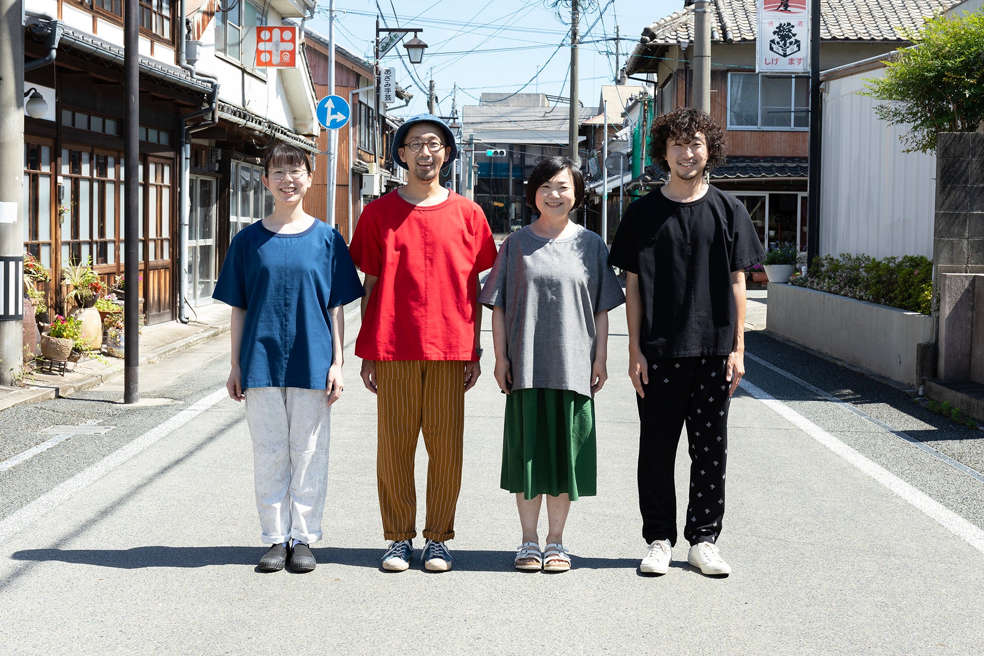 うなぎの寝床の各店舗(アクロス福岡、ららぽーと福岡店、旧丸林本家)では、7月上旬より先行販売。(写真左から)ブルー、レッド、グレー、ブラック計4色の久留米絣のTシャツがオンラインショップにも登場!