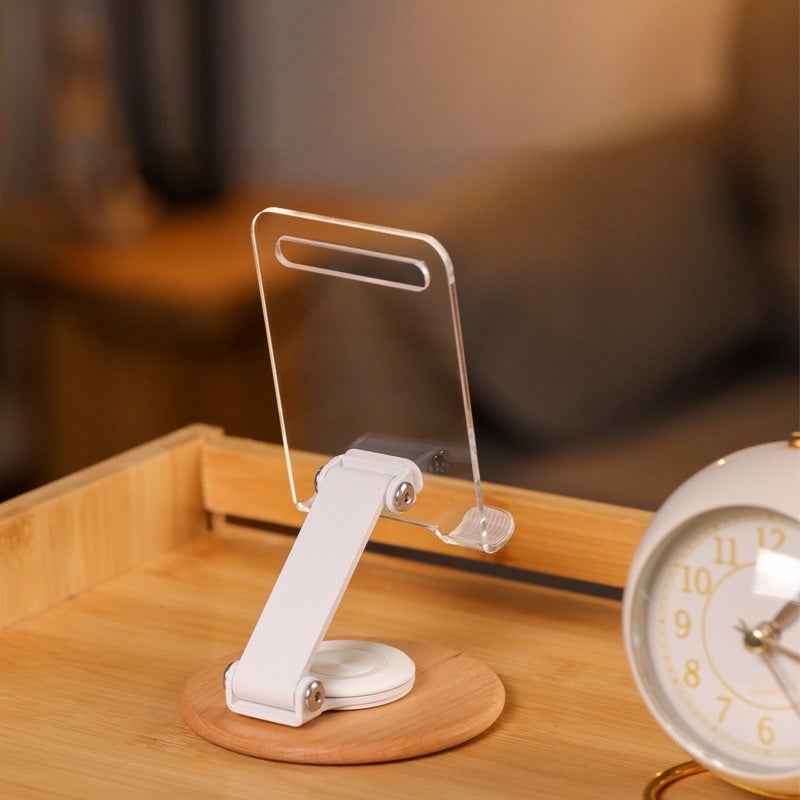 スマホやタブレットに対応したアクリルスタンドです。透明なスタンドがスタイリッシュで、台座は木目調でナチュラルにインテリアに馴染みます。アームは360°自由に回り、コンパクトに折りたためるので実用性も抜群です。