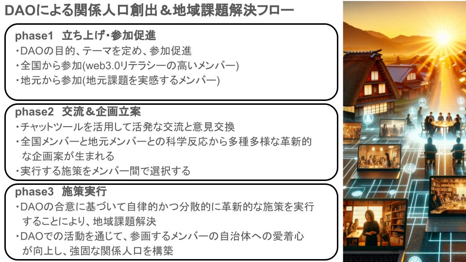 本ソリューションは、地域おこし協力隊の制度範囲内で『適任者の募集・選定』『着任中サポート』『デジタル技術の提供』の3つのサービスを一気通貫で提供することにより、自治体のDAO設立への取り組みを強力に推進し、地域活性化とDXを加速させます。