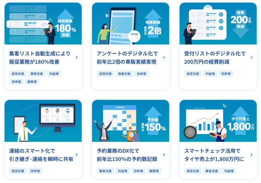 「cars MANAGER」の業務フィットしたスマート機能群を活用し、「利益増」「顧客増」「効率増」 を実現したノウハウをサクセスストーリーとして、実践しやすいように、わかりやすい動画でご覧いただけます。