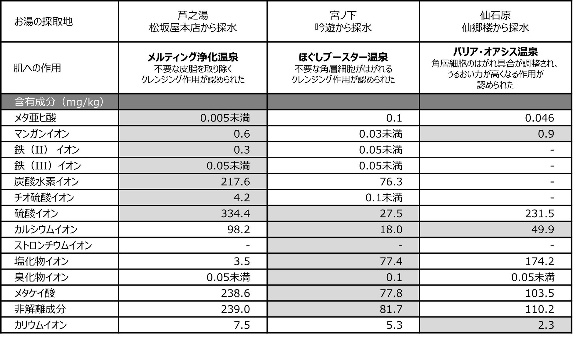 さらにお湯に含まれる成分と美肌泉質の関連性を検討した結果、成分組成のバランスの違いが美肌作用に影響を及ぼしていることが分かりました。