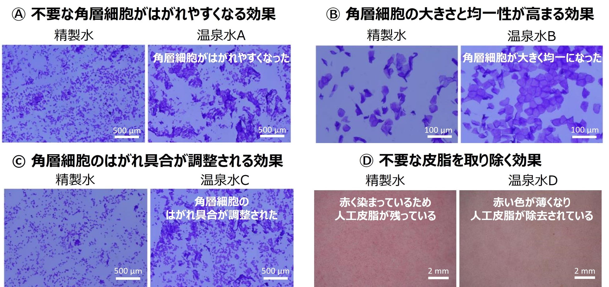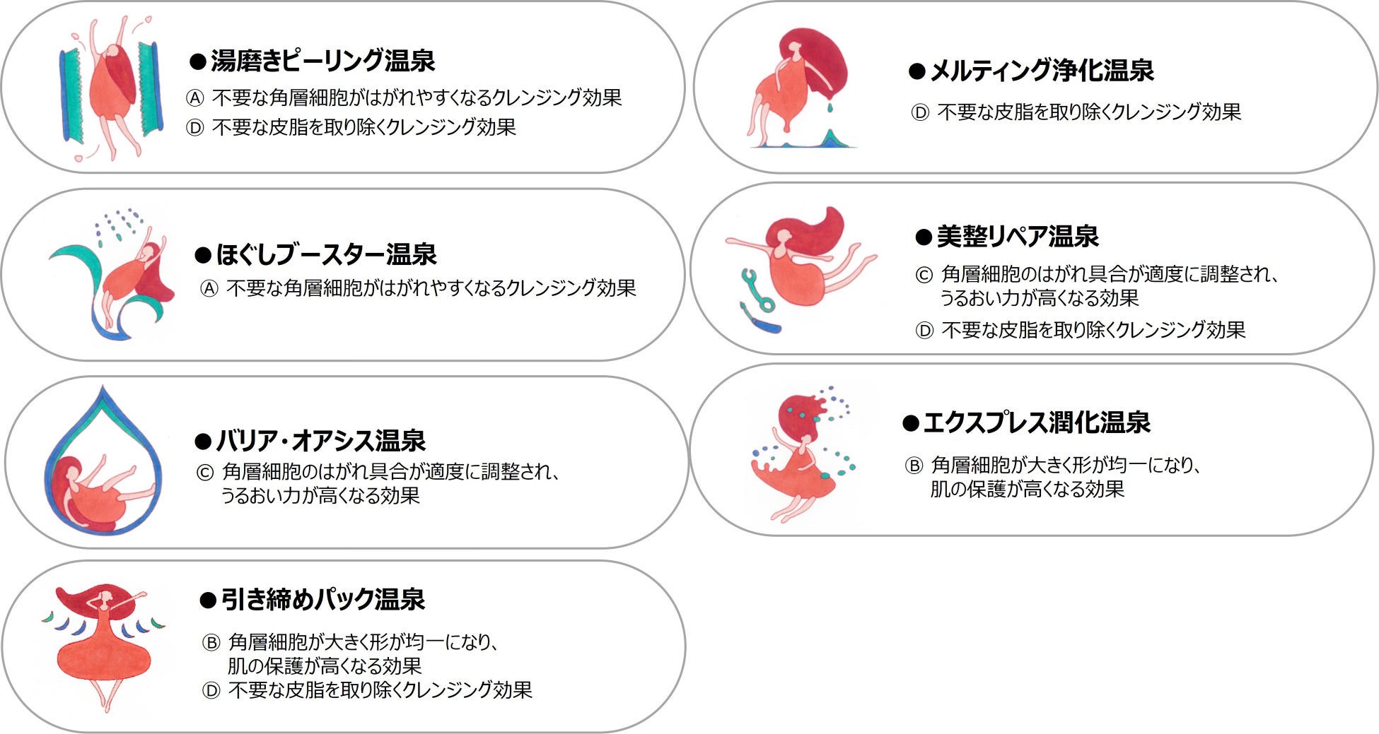 美肌温泉プロデュースタスクフォースでは、各地の温泉地で実際にお客様の肌にふれる浴槽に注がれる温泉水の肌への作用を研究・評価しています。これまでに、化粧品会社として培った肌分析技術により温泉水の角層や皮脂への作用に注目した分析を重ね、国内で7種の美肌泉質を見つけました(補足資料1)。