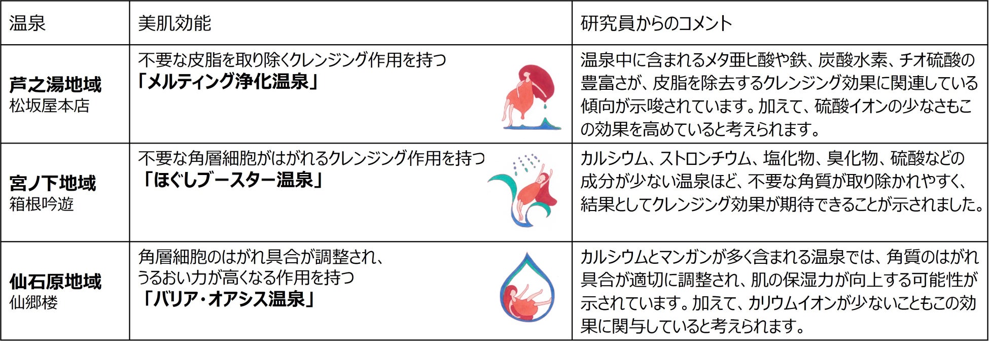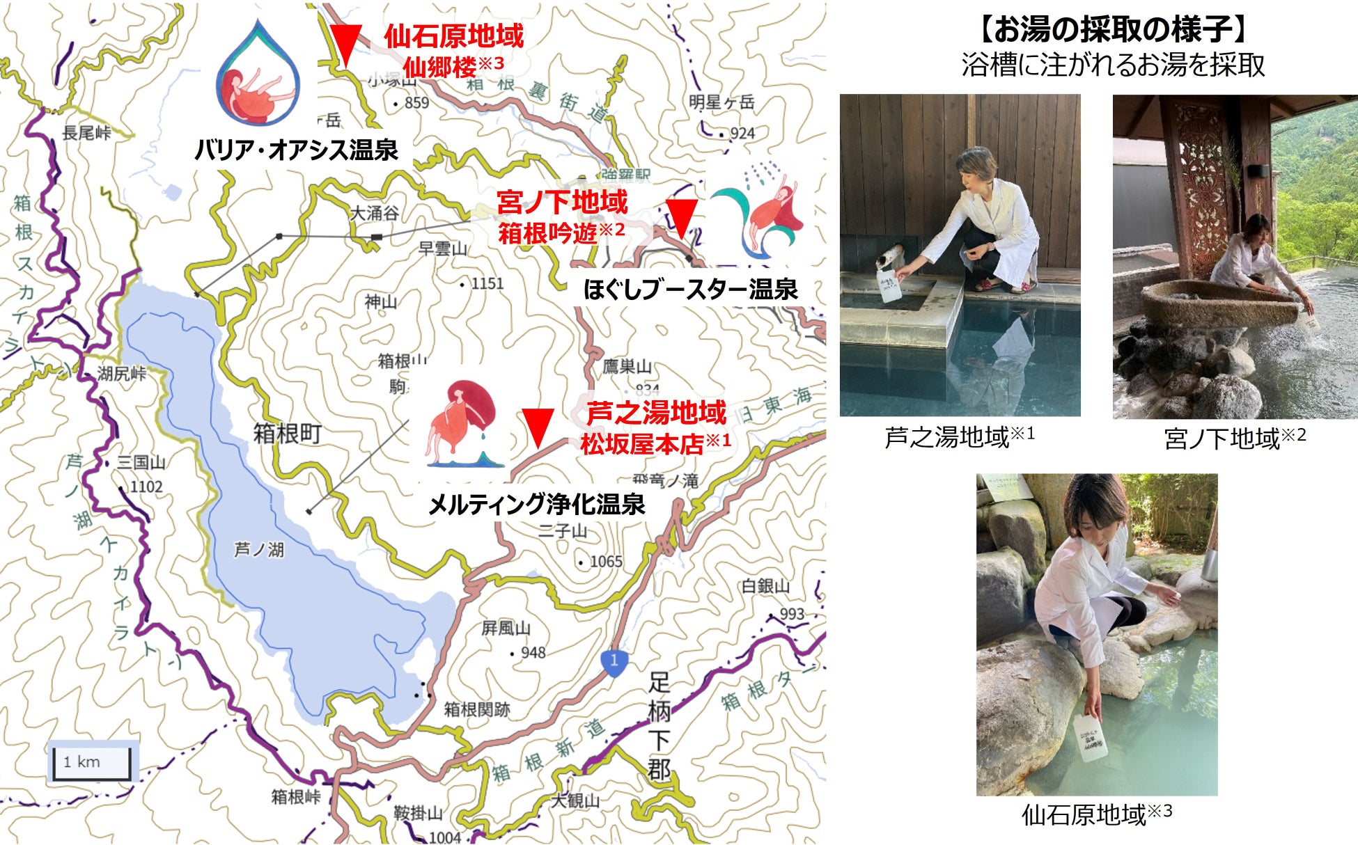 全国的に見ても変化に富んだ火山地形により多数の特徴ある泉質の温泉が湧いている箱根に着目し、複数の温泉について分析を行いました。箱根の温泉地のうち、「芦之湯」「宮ノ下」「仙石原」の温泉宿1カ所ずつにおいて、浴槽に注がれるお湯を採取し分析しました。その結果、芦之湯(※1)では不要な皮脂を取り除く「メルティング浄化温泉」、宮ノ下(※2)では不要な角層細胞をはがしてくれる「ほぐしブースター温泉(※4)」、仙石原(※3)では角層細胞のはがれ具合を調整しうるおい力を高める「バリア・オアシス温泉(※4)」が存在することが確認され、箱根はバラエティ豊かな美肌泉質に恵まれていることが分かりました。