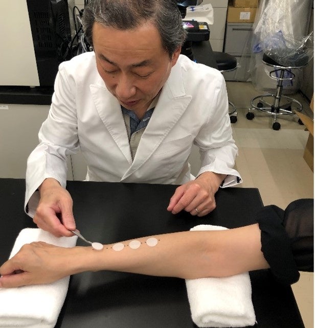 41℃の温泉水または精製水をろ紙に含ませ、腕に10分間置いた(図5)後、角層細胞を粘着テープで採取し染色・観察しました。肌のうるおい力や保護力との関連が分かっている「角層細胞のはがれ具合・大きさ・形」をもとに温泉の作用を判定しました。