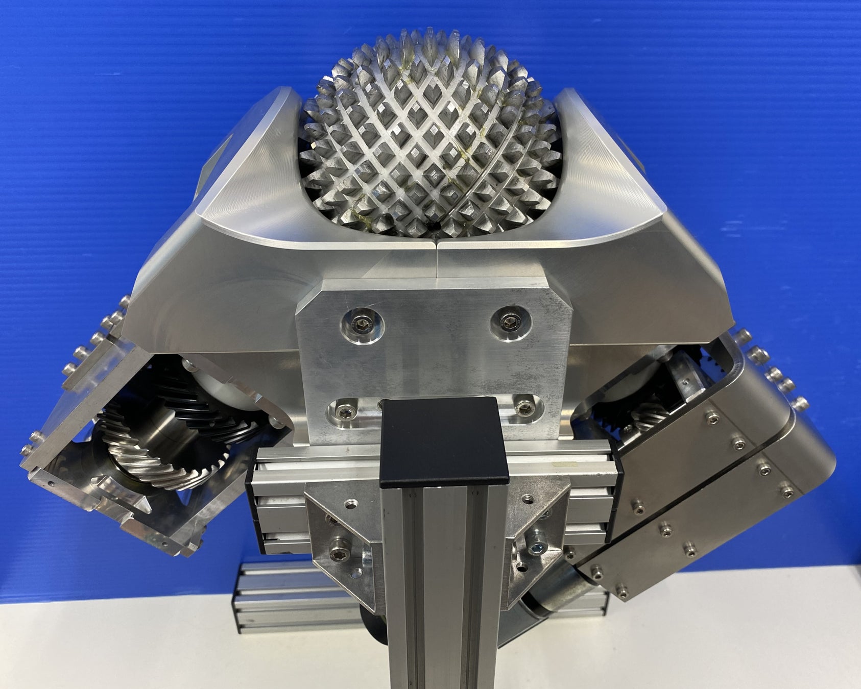 無制限の可動域を持つ「球状歯車」。広い可動範囲を有するロボットアームの関節などに応用可能な、3自由度を有する金属製の球状歯車を展示し、様々な動作のデモンストレーションを行います。