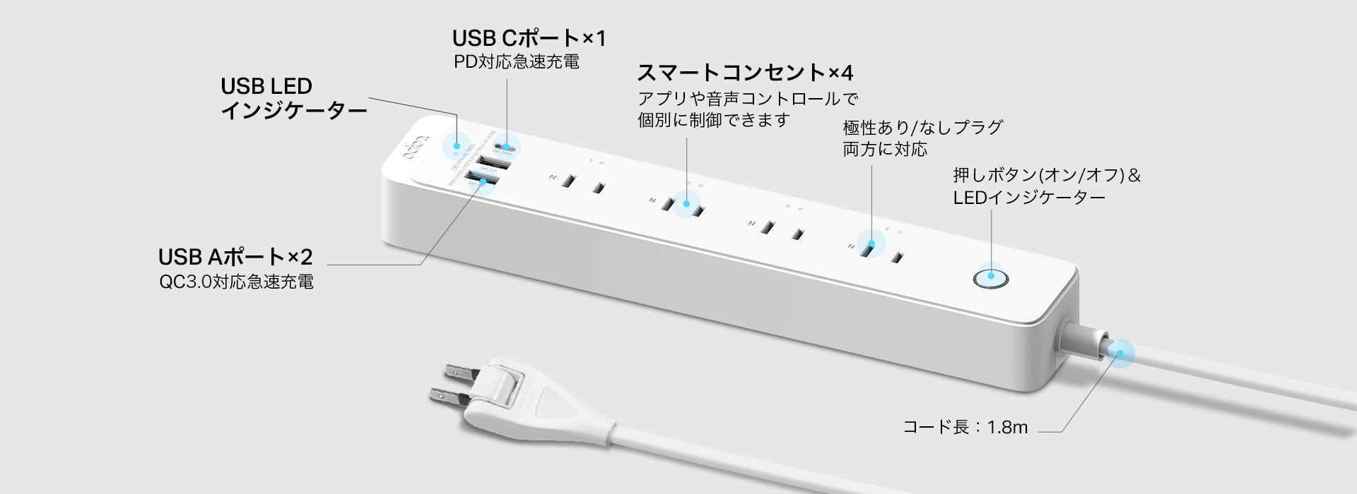 *1:4つのスマートコンセントは個別に制御可能です (音声操作およびリモコン含む)。3つのUSBポートは、音声アシスタントまたは互換性のあるアプリでのみ一括管理できます。USBポートは個別に操作はできず、3つのポートをまとめて操作する形になります。