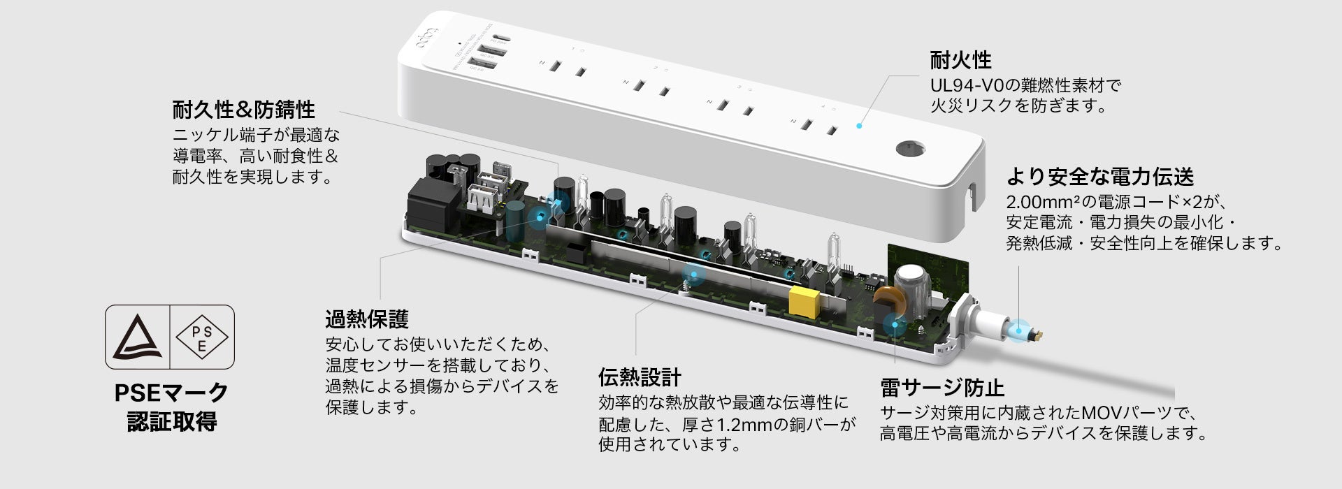 ・ 安心の保護対策:厳しい自社テストとV-0(UL94)の難燃性素材を使用する等高い安全性