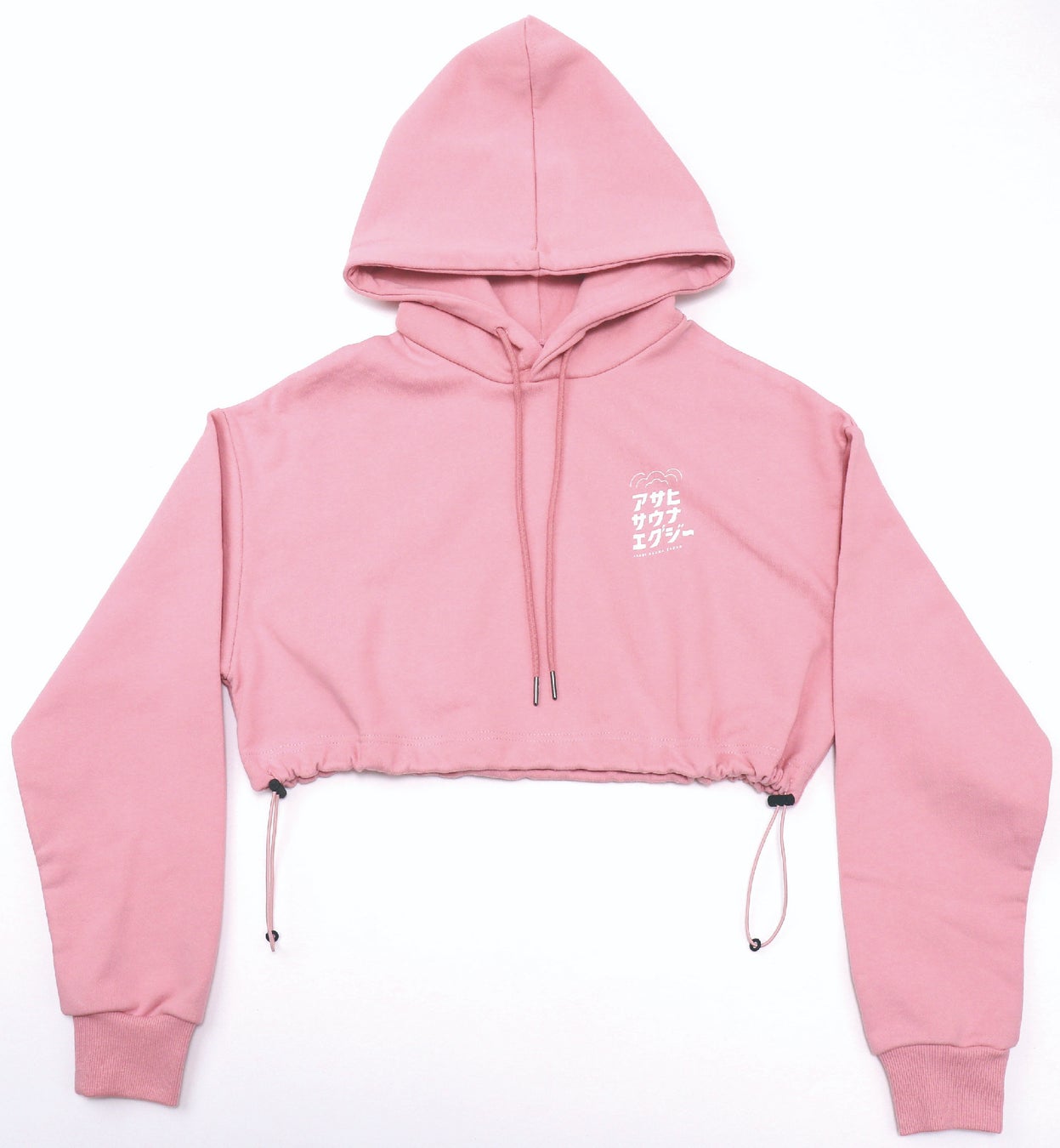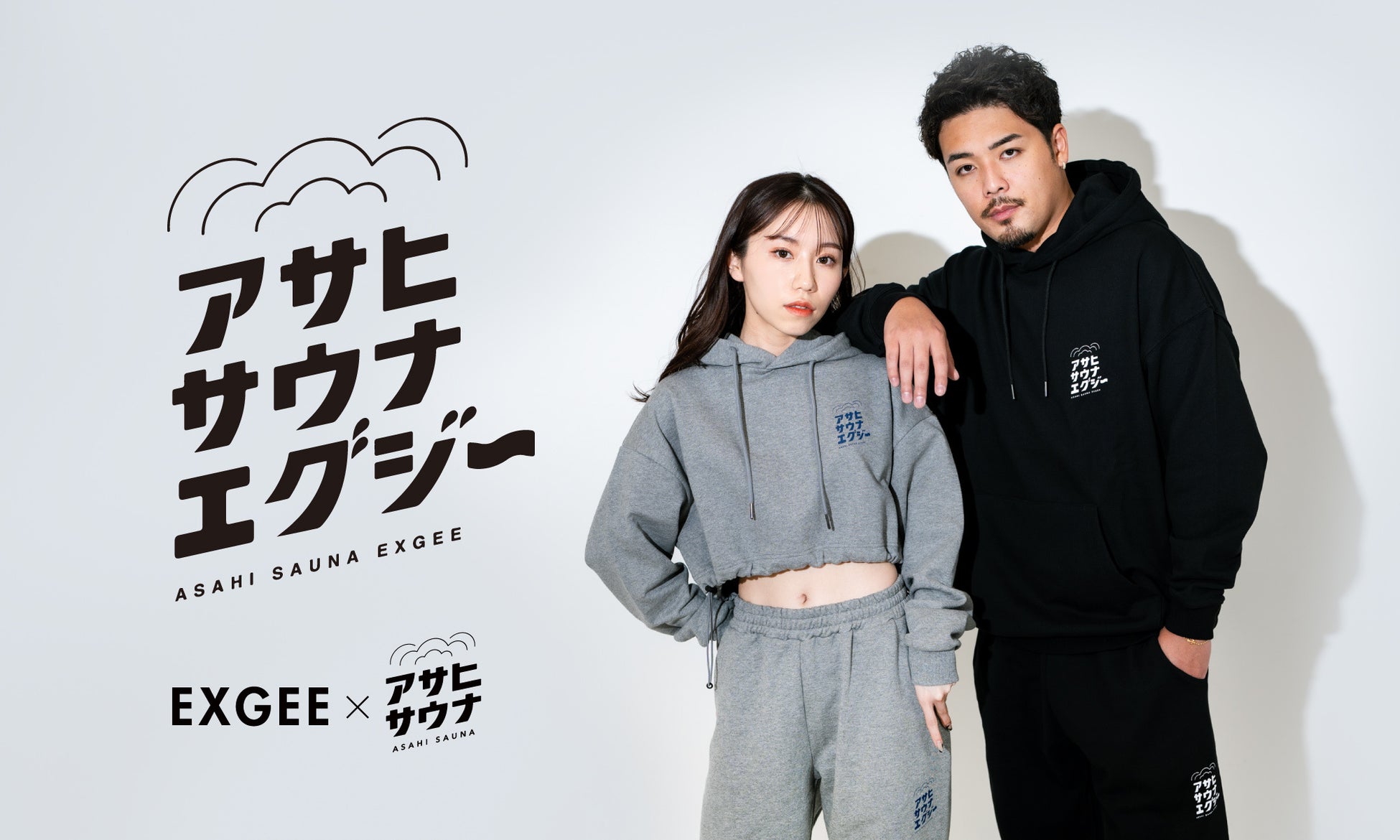 商品概要:トレンドのクロップド丈のパーカー。ウエスト部分のコードを使用してシルエット調整が可能。胸にはEXGEE×アサヒサウナのロゴプリント。