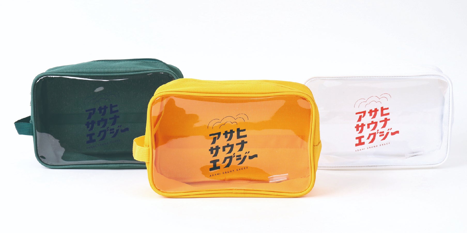 商品概要:お風呂やサウナセットを持ち運ぶのに便利なサイズのPVCポーチ。普段使いも可能な万能アイテム。EXGEE×アサヒサウナのコラボロゴをプリント。