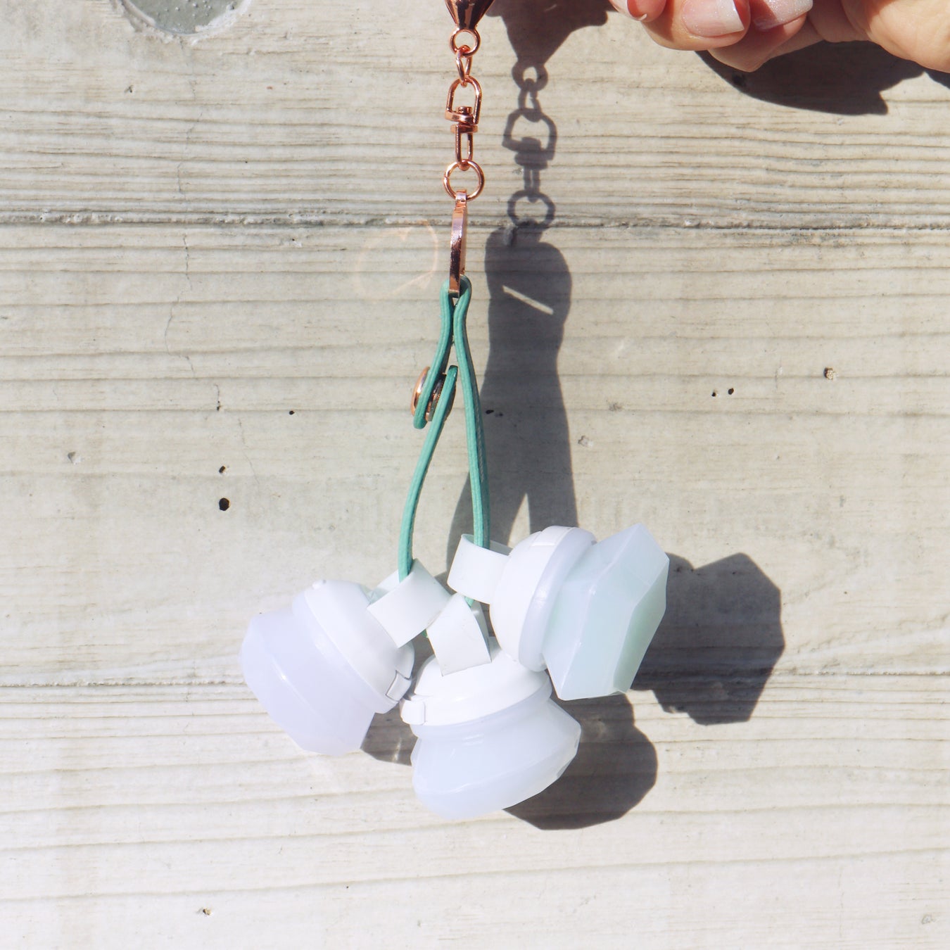 ボタンを外してリングライトを通せば、可愛く持ち運べるキーホルダーに!