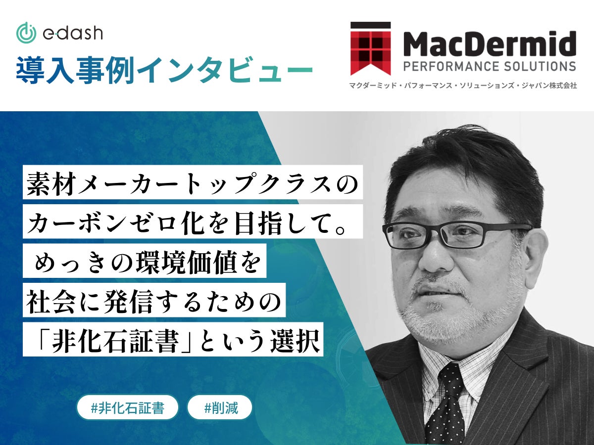 CO2排出量可視化のクラウドサービス「e-dash」を提供するe-dash株式会社(本社:東京都千代田区、代表取締役社長:山崎冬馬、読み:イーダッシュ、以下「当社」)は、金属等表面処理用化学薬品や関連機器装置の製造・輸出入及び販売を行うマクダーミッド・パフォーマンス・ソリューションズ・ジャパン株式会社(本社:神奈川県平塚市、代表取締役社長:ジュリアン・ベイショア、以下「マクダーミッド」)が、当社が提供するe-dash Carbon Offsetの「非化石証書の代理購入サービス」を通じて非化石証書を購入し、使用電力の実質再生エネルギー化・カーボンフリー化に取り組まれた背景や課題について取材した導入事例記事を公開したことをお知らせします。