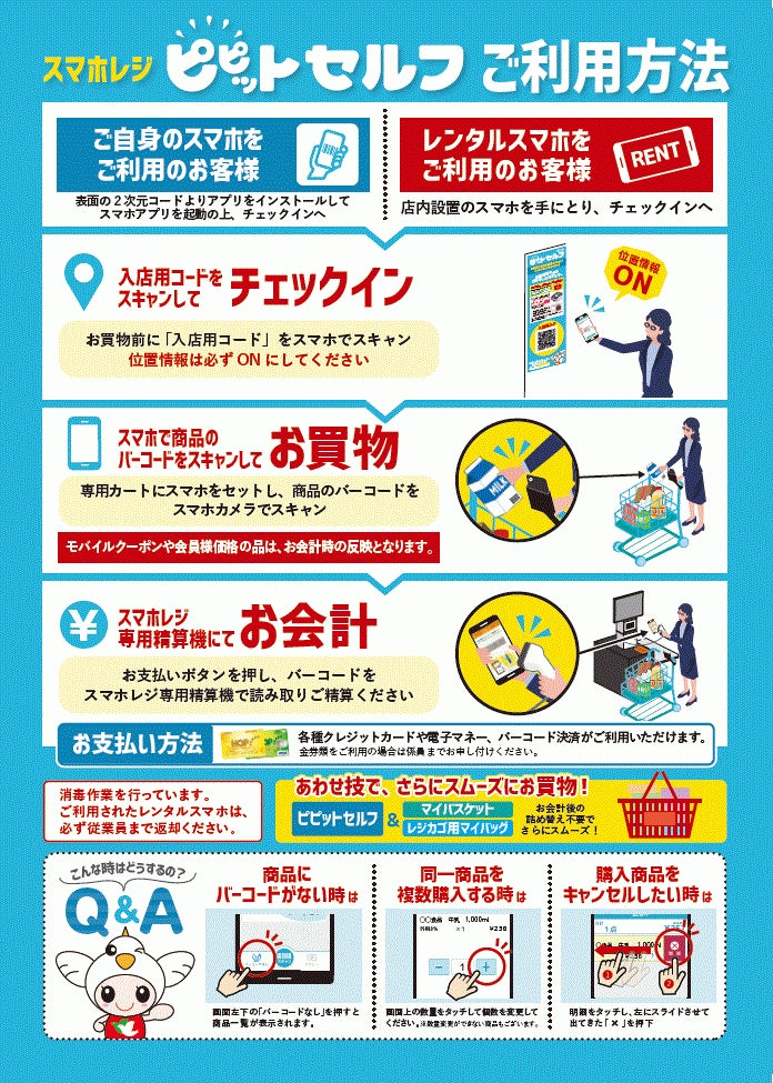 売場では、スマートフォンで商品のバーコードを読み取りますので、お買い上げ金額を確認しながらお買い物が可能で、スマートフォンでの読み取り操作は、お子様にも大人気です。また、お会計はピピットセルフ専用精算機をご用意していますので、レジ待ち時間の短縮に繋がり、お会計が大変スムーズです。