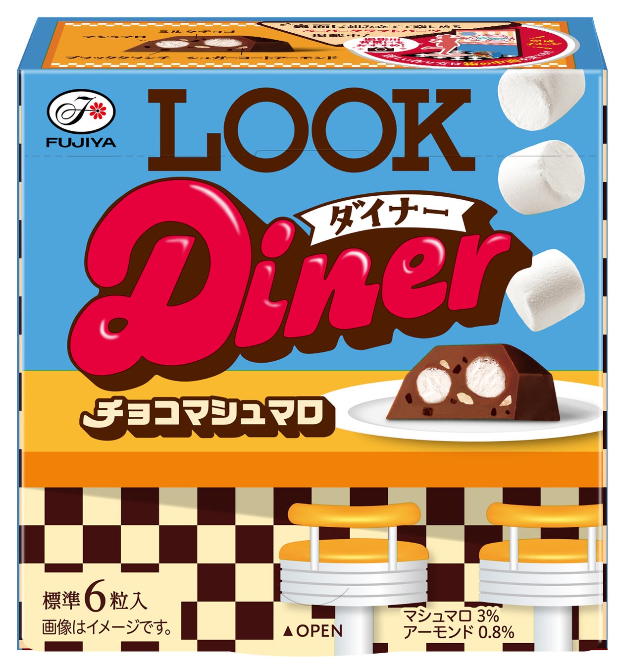 不二家のロングセラーブランド「ルック」よりアメリカンレトロをコンセプトにした「ルックダイナー」が登場します。裏面に組み立てて遊べるペーパークラフトが付いたポップなパッケージや、存在感のあるゼリーやマシュマロを入れたアメリカンテイストなフレーバーの大粒チョコレートで、アメリカンダイナーの世界観をお楽しみいただけます。