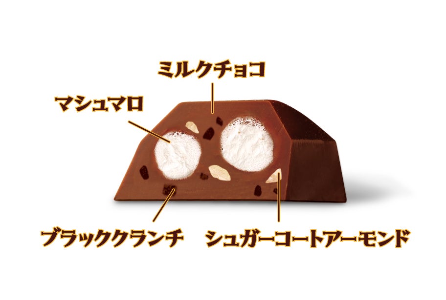 ・マシュマロのむにっとした食感と、シュガーコートアーモンド、ブラッ ククランチのざっくりとした食感が愉しめる