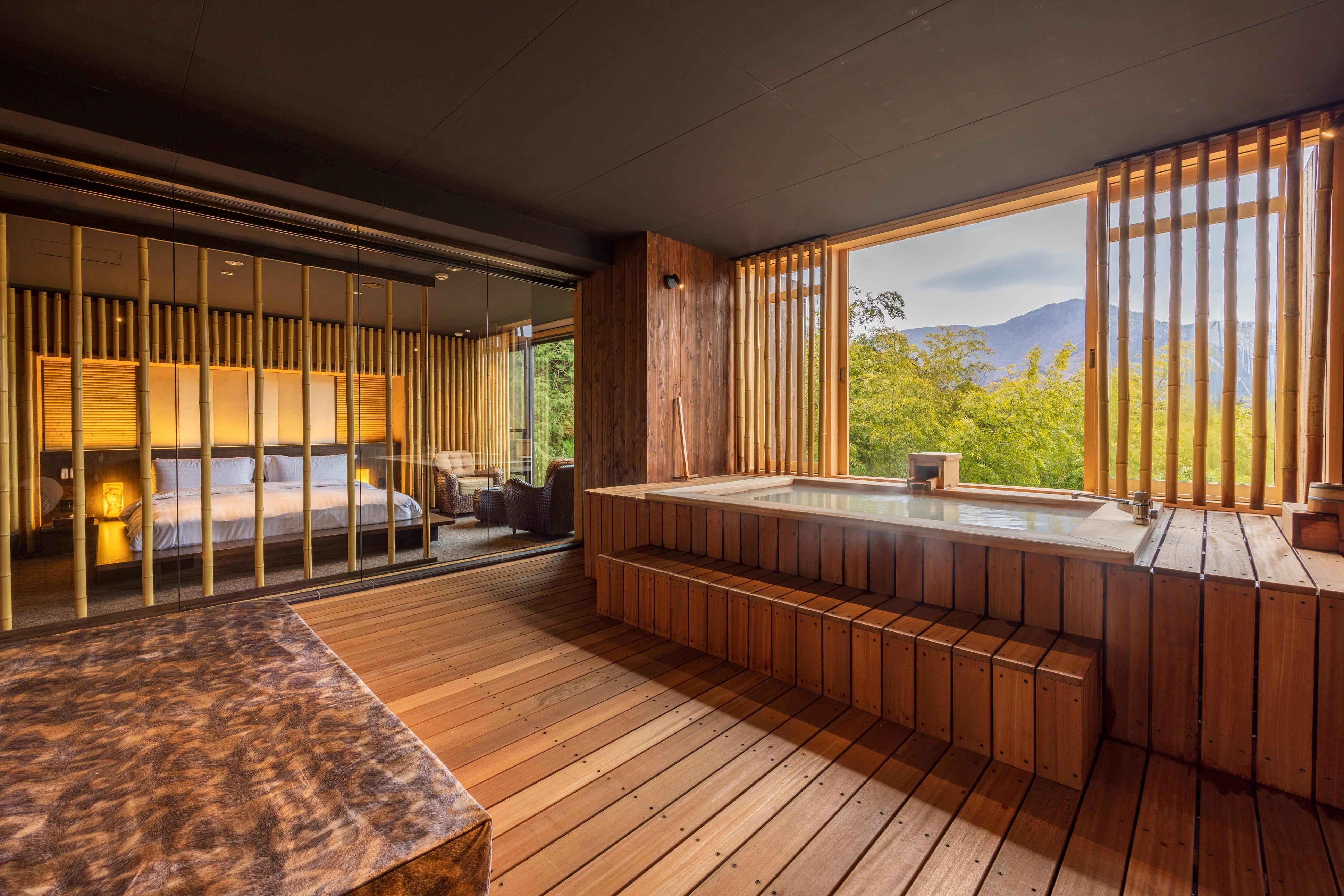 渓谷の吊り橋を渡り、“癒しの森 塔ノ澤”へようこそ。敷地面積約20,000坪という広大な自然を背景として、塔ノ澤の自然に溶け込む為のこだわりの空間を提供しています。ノーラインリゾートという考えのもと、サービス・空間・環境の全てにおいて線を引かないという意味合いを実現した、まさに塔ノ澤の自然を肌で感じる事の出来る究極の癒しの旅館施設としています。客室は全8タイプ23の部屋は全室露天風呂付き。