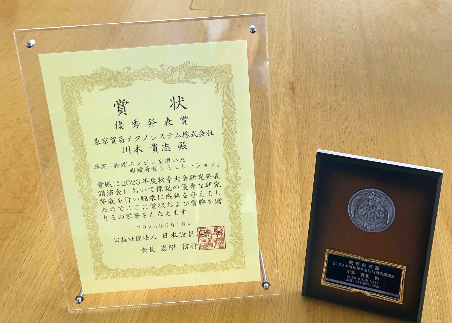 今回、東京貿易テクノシステム株式会社 川本貴志が「物理エンジンを用いた眼鏡着装シミュレーション」で優秀発表賞を受賞したことは大変な喜びであり、これを励みとし、今後も事業活動とともに技術の発展のために邁進いたします。