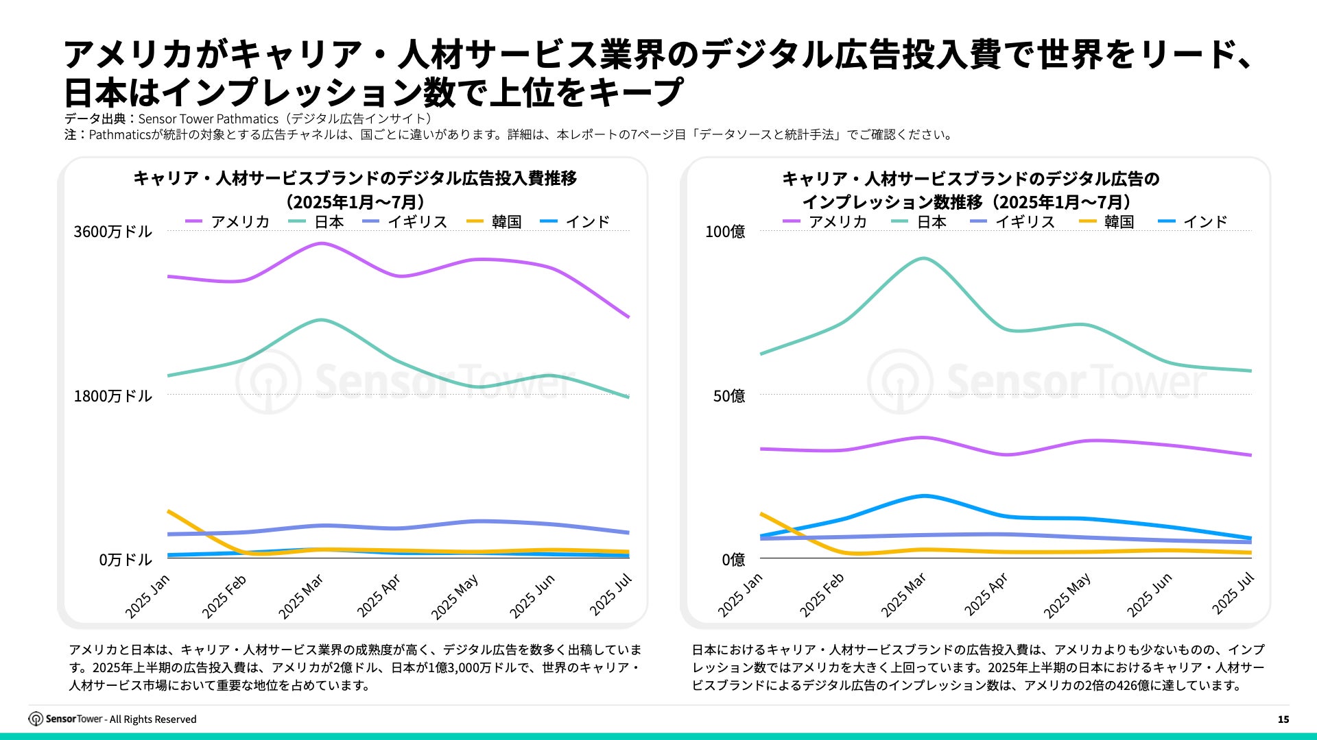 アメリカと日本は、キャリア・人材サービス業界の成熟度が高く、デジタル広告を数多く出稿しています。2025年上半期の広告投入費は、アメリカが2億ドル、日本が1億3,000万ドルで、世界のキャリア・人材サービス市場において重要な地位を占めています。