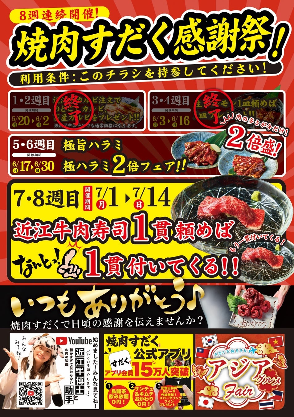 株式会社総合近江牛商社(本社:滋賀県守山市/代表取締役社長:西野 立寛)が運営する【近江焼肉ホルモンすだく】は、2024年5月20日(月)~7月14日(日)の8週にわたり、下記の対象店舗にて「焼肉すだく感謝祭」を開催いたします。