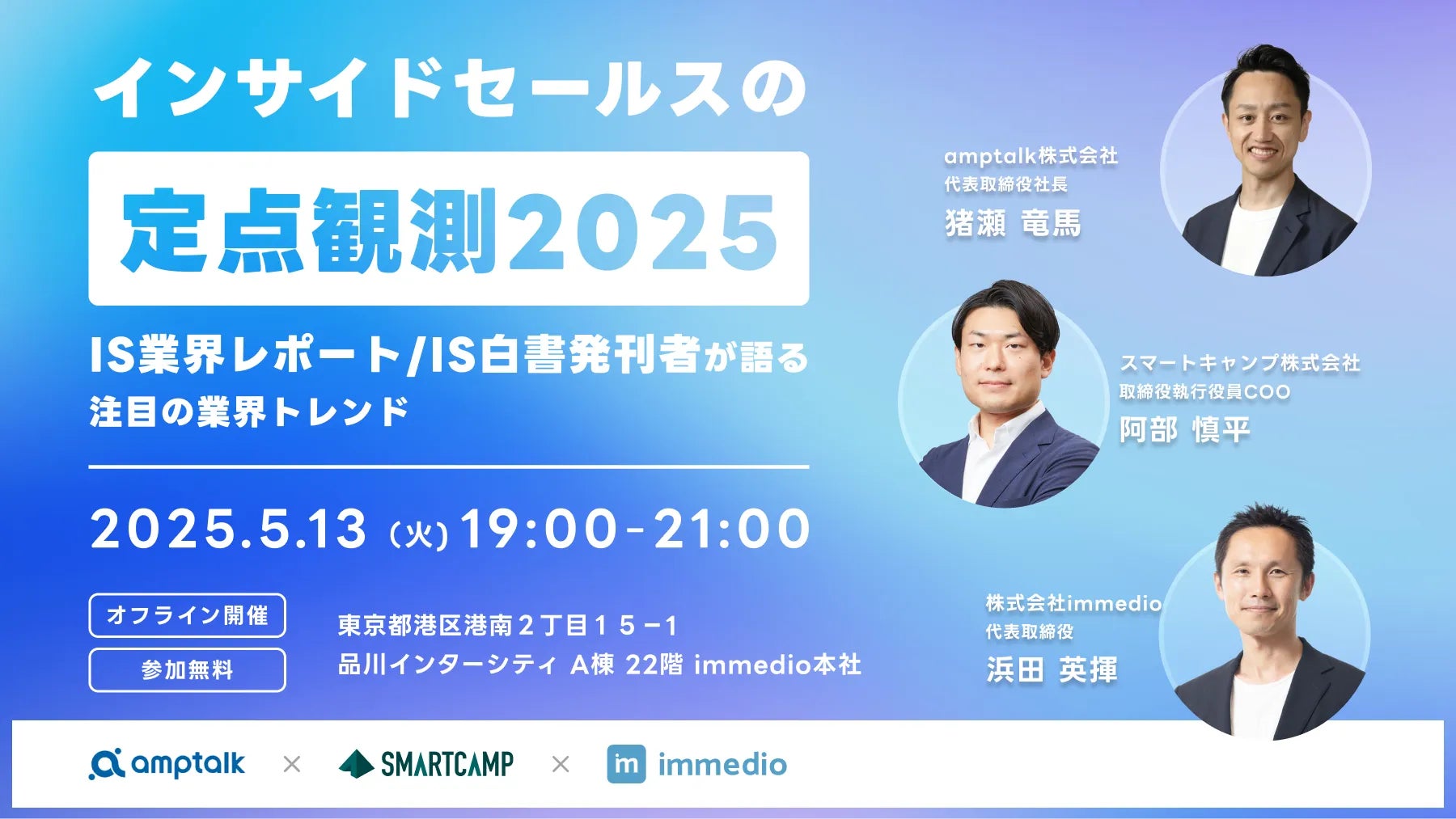 BtoB Web接客ツール「immedio(イメディオ)」を提供する、株式会社immedio(本社:東京都港区、代表取締役:浜田 英揮、以下 immedio)は、2025年5月13日にimmedio本社にて『インサイドセールスの定点観測2025 IS業界レポート/IS白書発刊者が語る注目の業界トレンド』をスマートキャンプ株式会社、amptalk株式会社の共催で開催いたします。